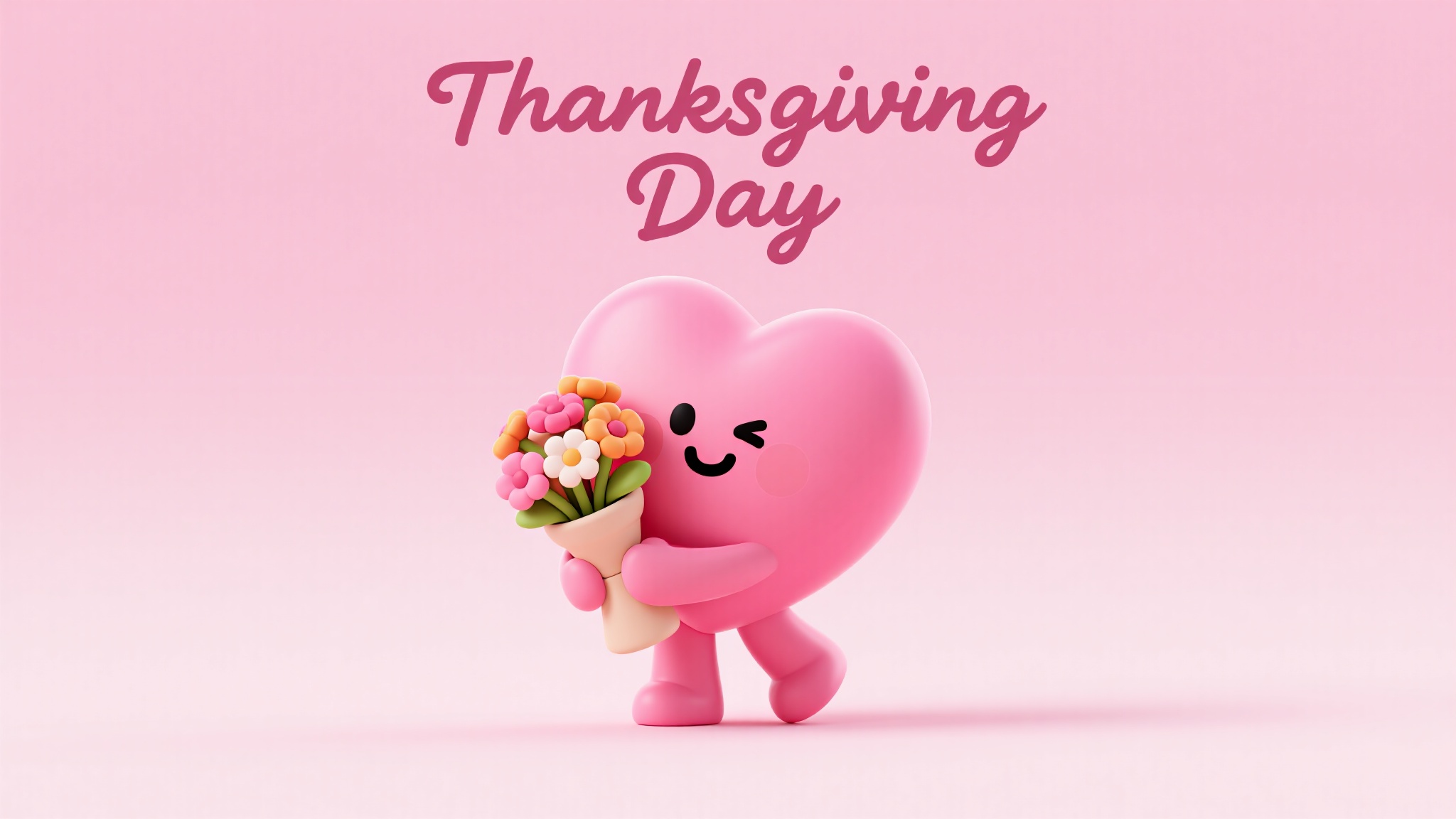 作品描述:粉色 3D 卡通风感恩节海报,英文 “Thanksgiving Day”,搭配 3D 粉色心形卡通角色(持花束、带笑脸);背景淡粉渐变,上方手写体 “Thanksgiving Day”。