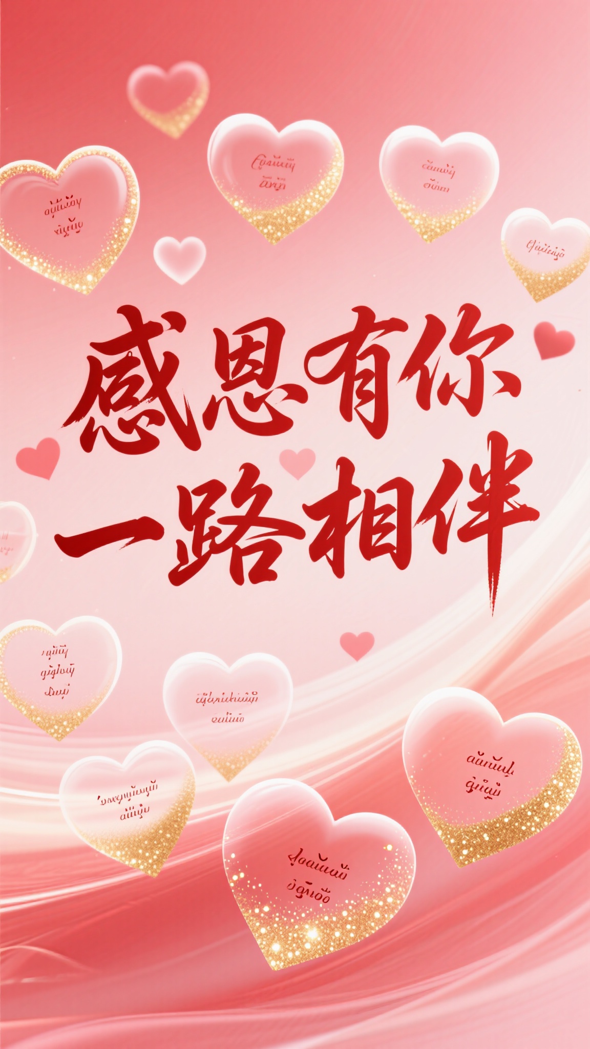 作品描述:红粉渐变背景,“感恩有你 一路相伴” 红金书法艺术字,搭配多语种(中、法、德、俄等)爱心气泡,气泡内文字多样,书法字笔锋带金粉质感,背景丝滑渐变带流动光效。