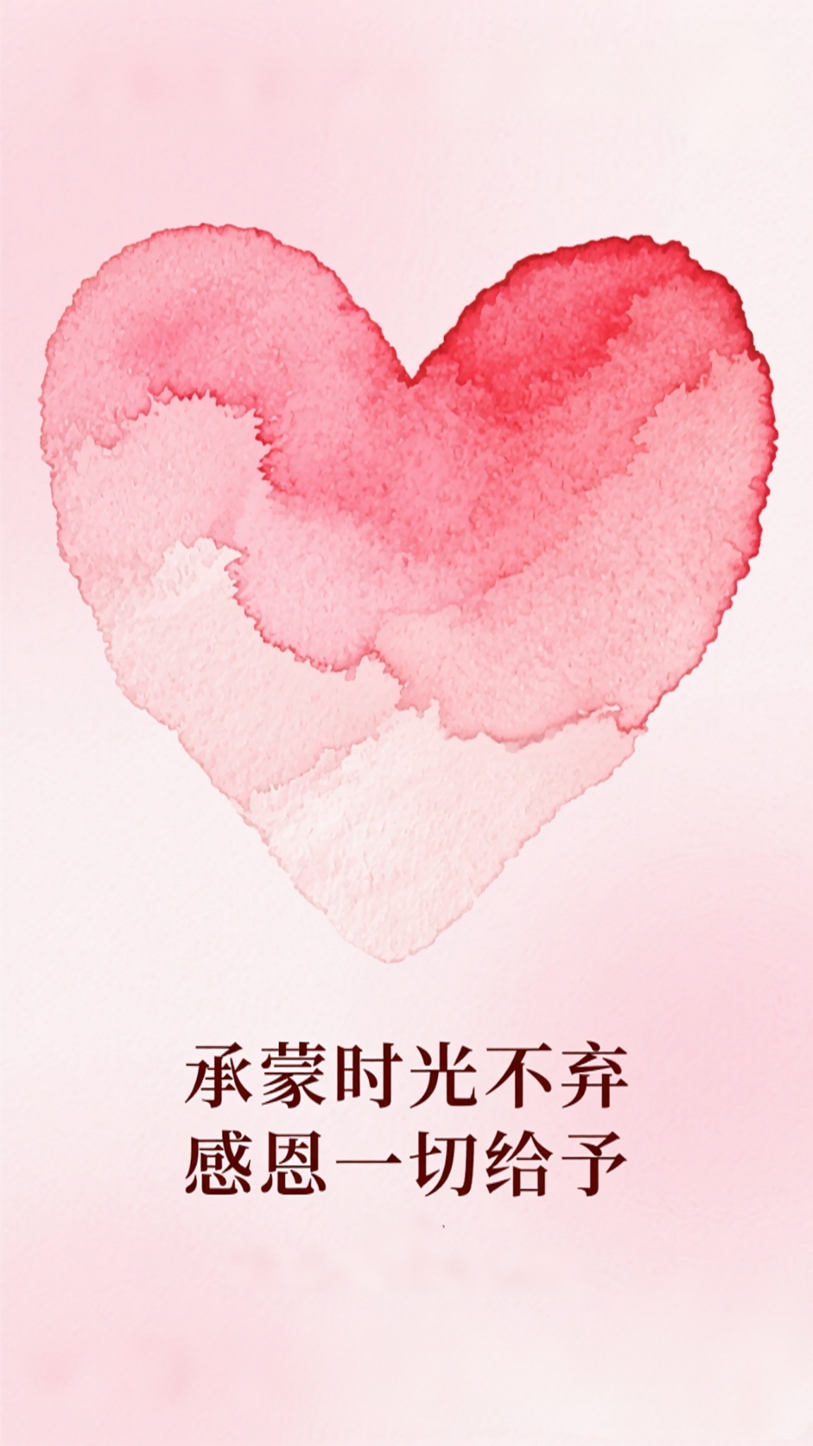 作品描述:粉水彩爱心感恩节海报 风格:粉渐变背景,水彩质感爱心(笔触粗糙自然),文字 “承蒙时光不弃 感恩一切给予”,排版简约文艺。尺寸建议:1080×2340px细节:水彩纹理自然,爱心色彩渐变(粉→红),文字复古排版。用途:文艺品牌感恩贺卡、女性社群情感海报。