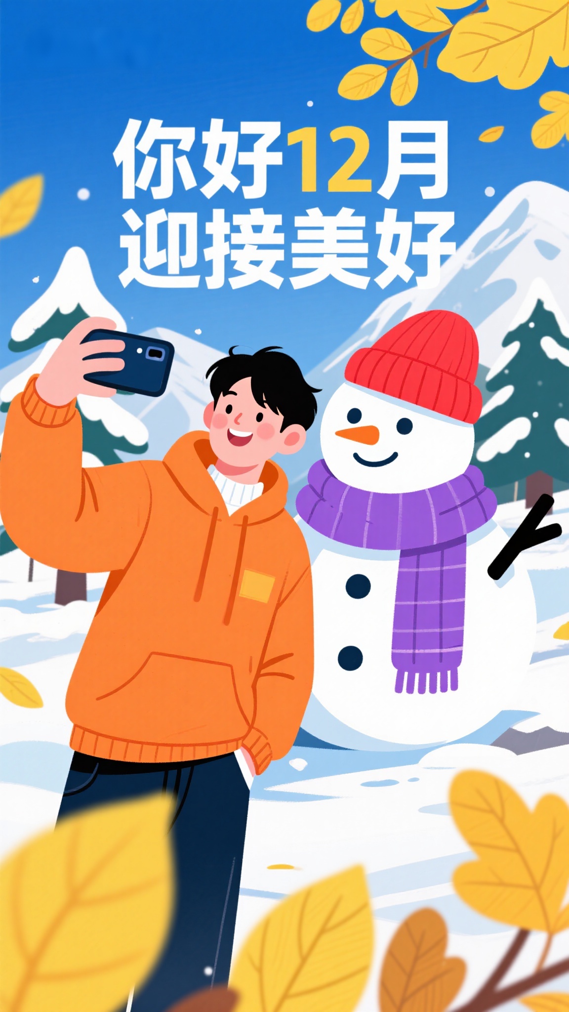 作品描述:雪人自拍 “你好12月 迎接美好” 活动海报 迎接美好 风格:潮流插画风,橙衣人物与圣诞雪人(红帽紫围巾、笑脸可爱)自拍,背景雪山、黄叶;细节:人物服饰明暗立体,雪人神态活泼,黄叶纹理清晰;用途:品牌月度活动推广、年轻人社交海报。