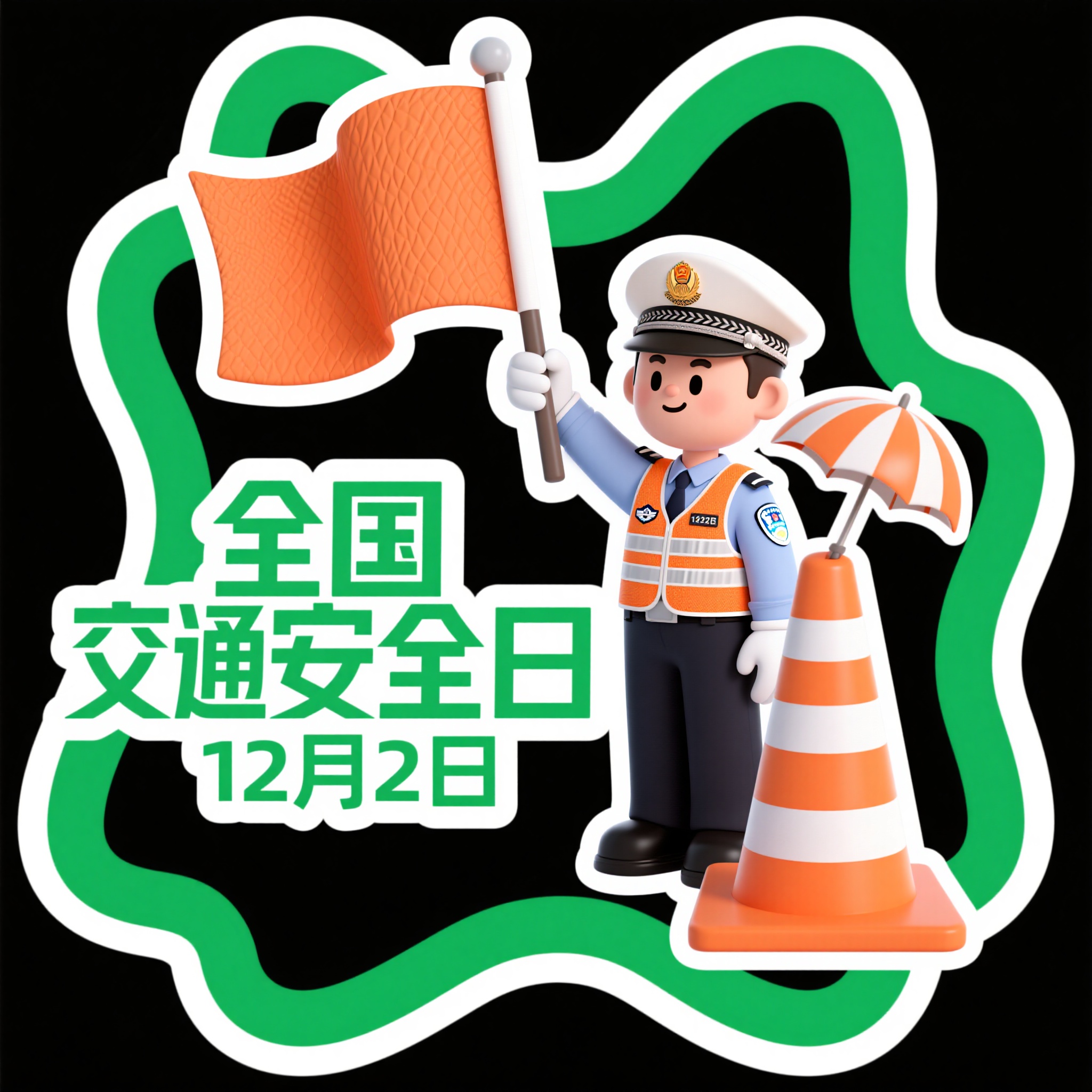 作品描述:举旗交警,全国交通安全日12月2日‘贴纸 风格:绿边异形风,元素含卡通交警(举旗动作、橙背心纹理、旗面细节)、路锥(橙白纹理、立体层次)、伞(褶皱细节);文字 “全国交通安全日 12月2日”。细节:异形边框的绿边设计、交警的帽子纹理、路锥的阴影层次。背景黑色