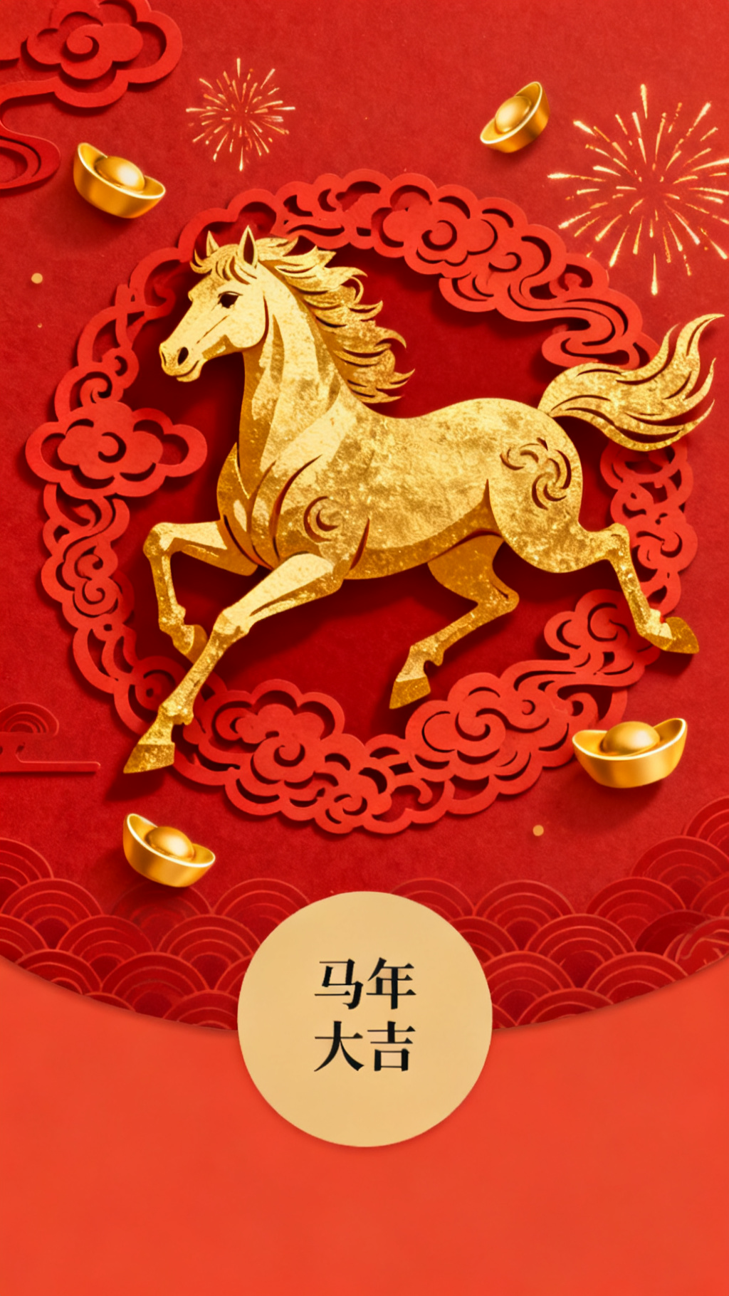 作品描述:一匹金色骏马在红色背景上奔跑,祥云图案环绕,金色元宝和烟花效果,中国传统剪纸风格,喜庆春节氛围,高清细节,矢量插画,红包封面设计,正面留白处加文字"马年大吉"