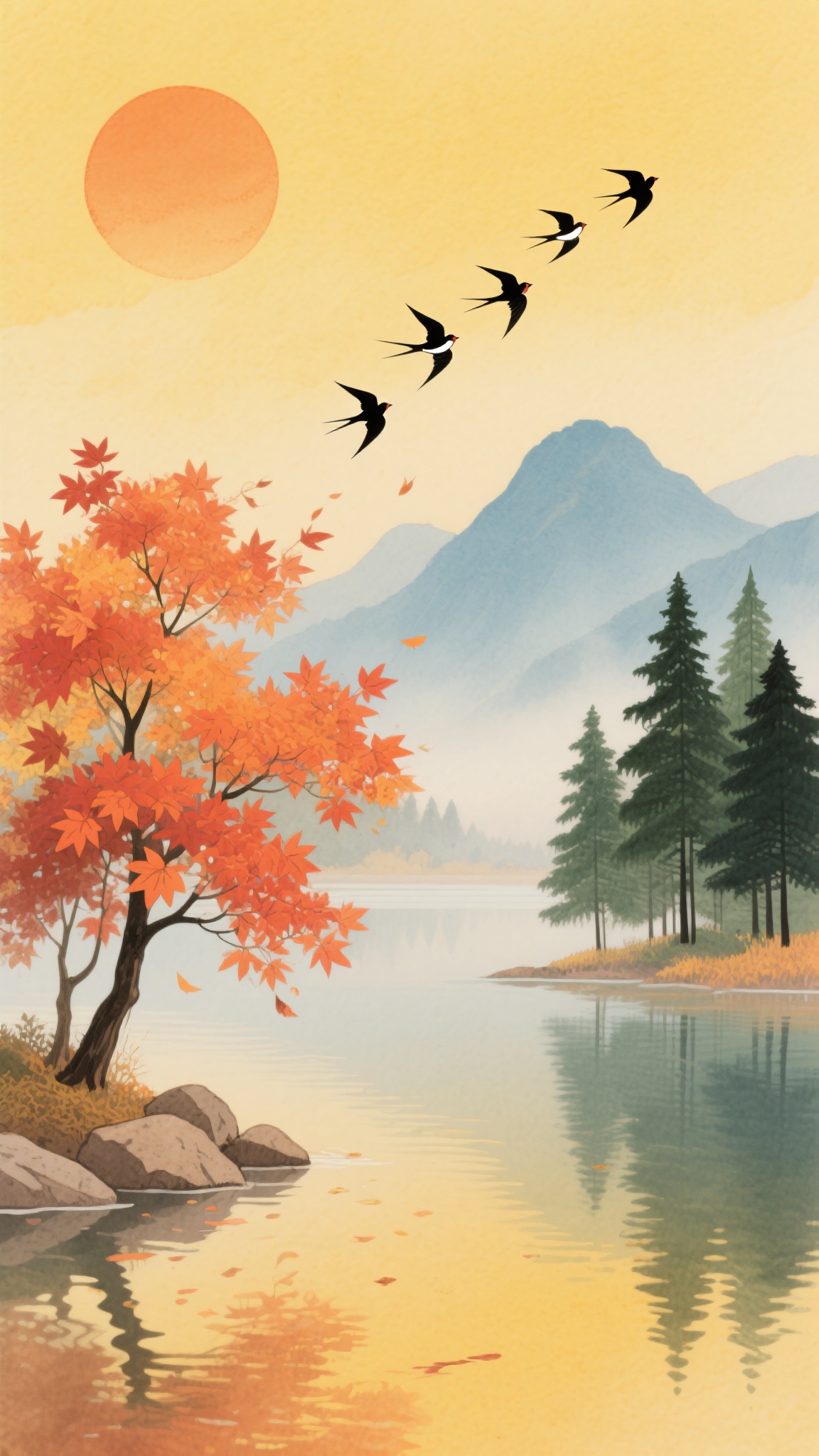 作品描述:生成一张图,比例 9:16,中国风水彩风格秋日山水插画。画面左侧是橙红色枫树(枝叶繁茂,叶片呈掌状,有飘落动态),树下为浅棕色岩石滩。中央是平静的江面,倒映着天空与树木的橙黄色调。右侧为墨绿色松树群(树干挺拔,树冠呈锥形),远处是淡蓝色山峦(山顶模糊,山间有薄雾)。天空为暖黄色,左上角有圆形落日(边缘柔和),六只黑色飞鸟呈人字形向右侧飞行。整体色调以橙红、金黄、墨绿为主,笔触湿润晕染,营造秋日傍晚的诗意氛围。