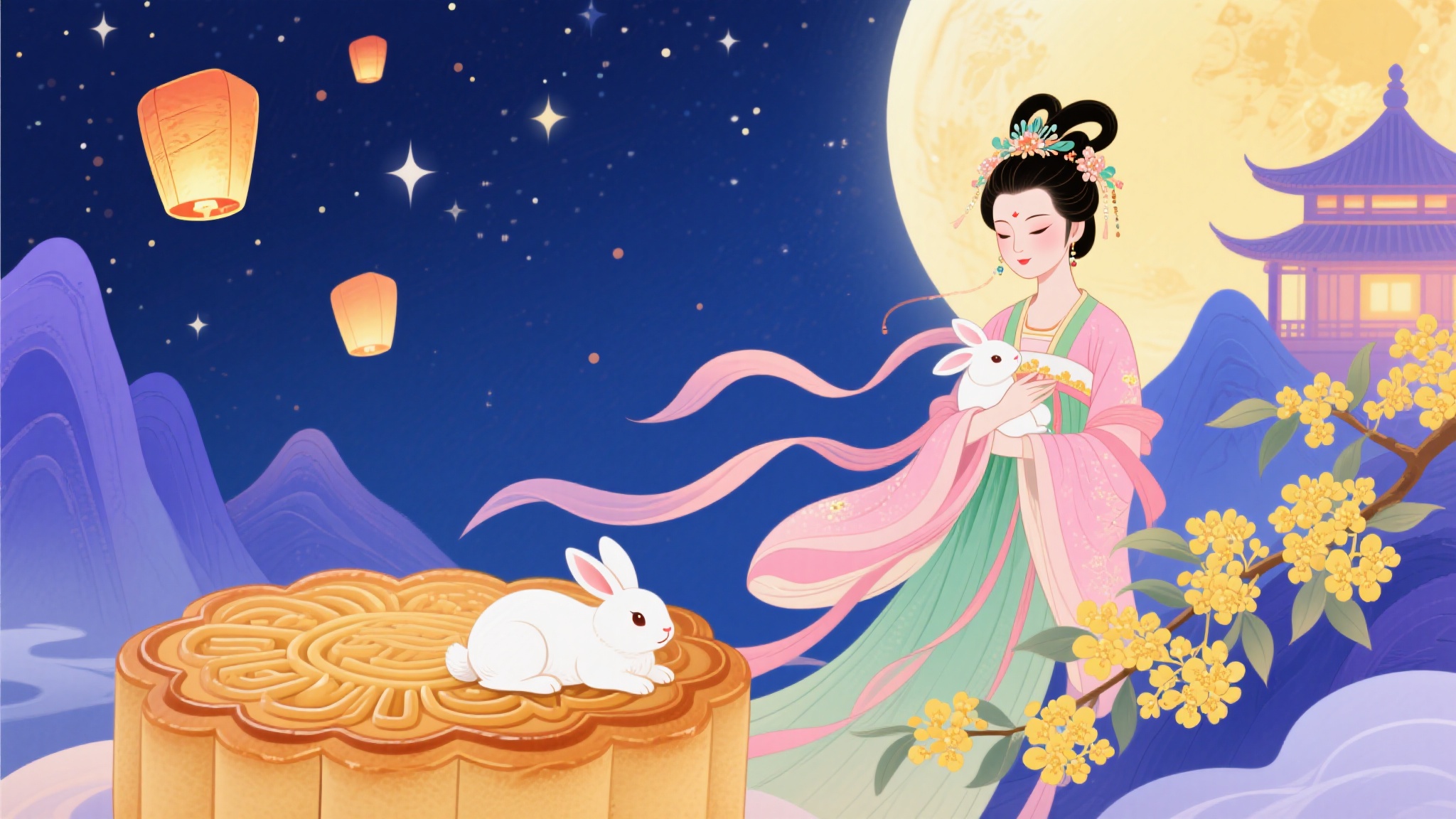 作品描述:中秋主题插画,深蓝色夜空(点缀闪烁繁星与漂浮的孔明灯),嫦娥身着飘逸的粉绿古风长裙(丝带随风舒展,发饰精美),怀抱白兔,身旁有金黄桂花枝(花朵饱满,香气仿佛溢出画面),巨大的月饼造型上卧着白兔,背景是蓝紫色山峦与亮着暖光的仙宫,整体梦幻且充满中秋意境。