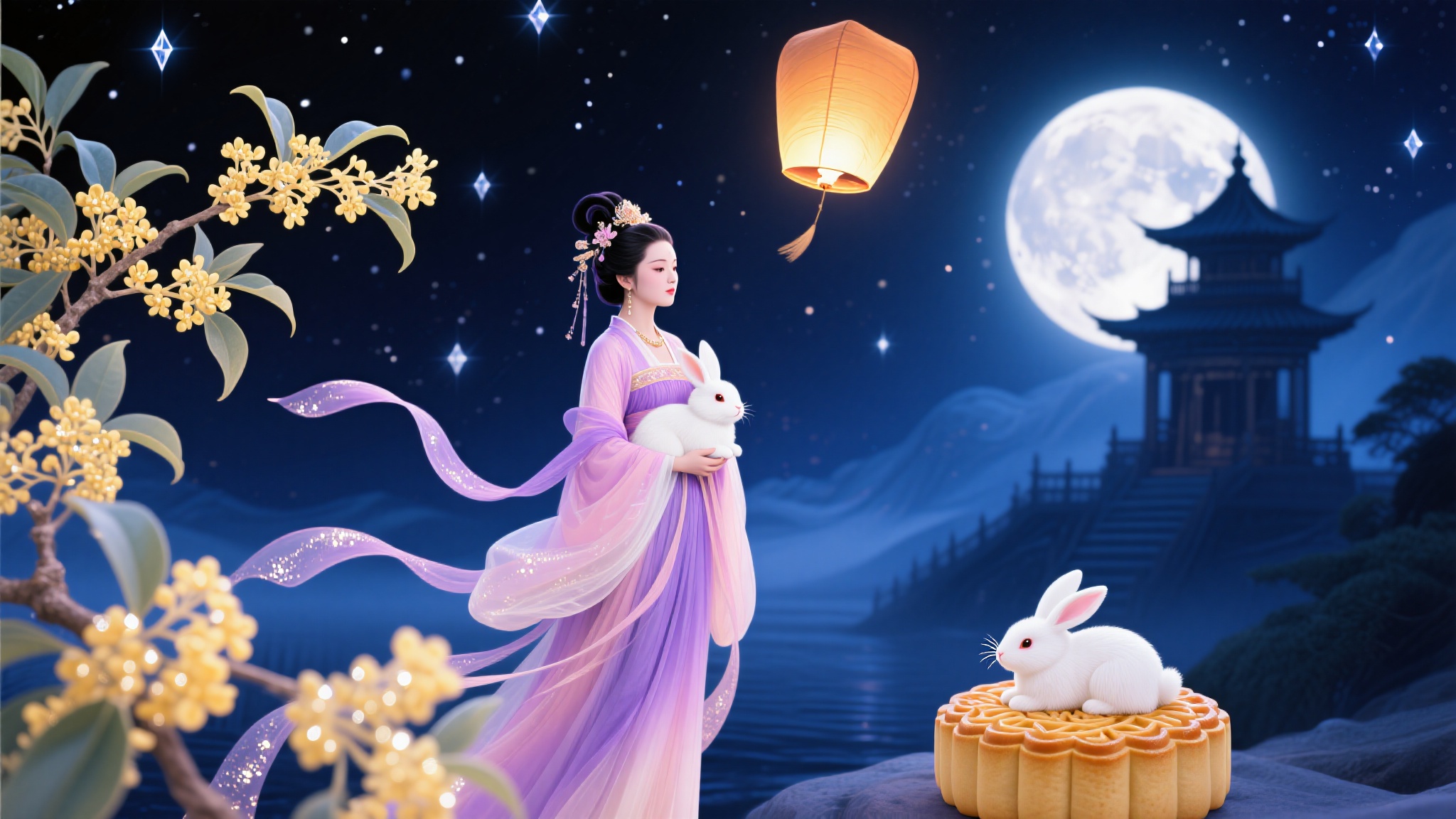 作品描述:中秋奇幻场景,深邃的蓝黑色夜空(星星如钻石般闪耀,孔明灯缓缓升空),嫦娥衣袂飘飘(粉紫渐变长裙,丝带灵动),怀中白兔温顺,桂花树枝叶繁茂(金黄花朵簇簇,花瓣边缘带细闪),月饼上的白兔慵懒可爱,远处仙宫在月光下轮廓清晰,营造出神秘又浪漫的中秋氛围。
