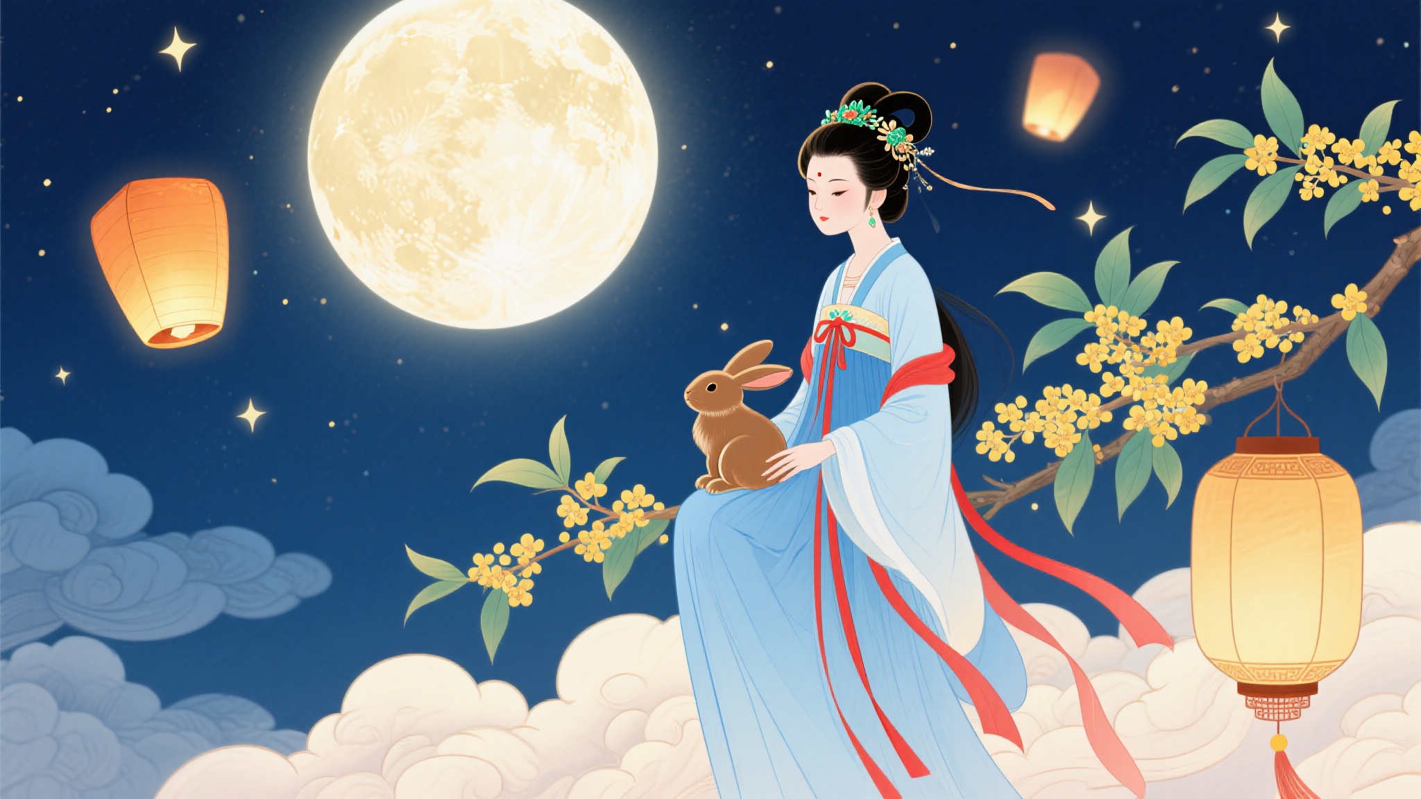 作品描述:中秋古风插画,深蓝夜空(云朵如丝绒般,孔明灯星星点点),圆月皎洁明亮(散发柔和光晕,能看到月面细节),嫦娥穿淡蓝古风长裙(红色丝带点缀,发间翠饰精致),倚着桂花枝(花朵金黄,叶片翠绿,脉络清晰),身旁棕色玉兔乖巧,下方云朵蓬松,宫灯与桂花枝装饰画面,充满古典中秋韵味。