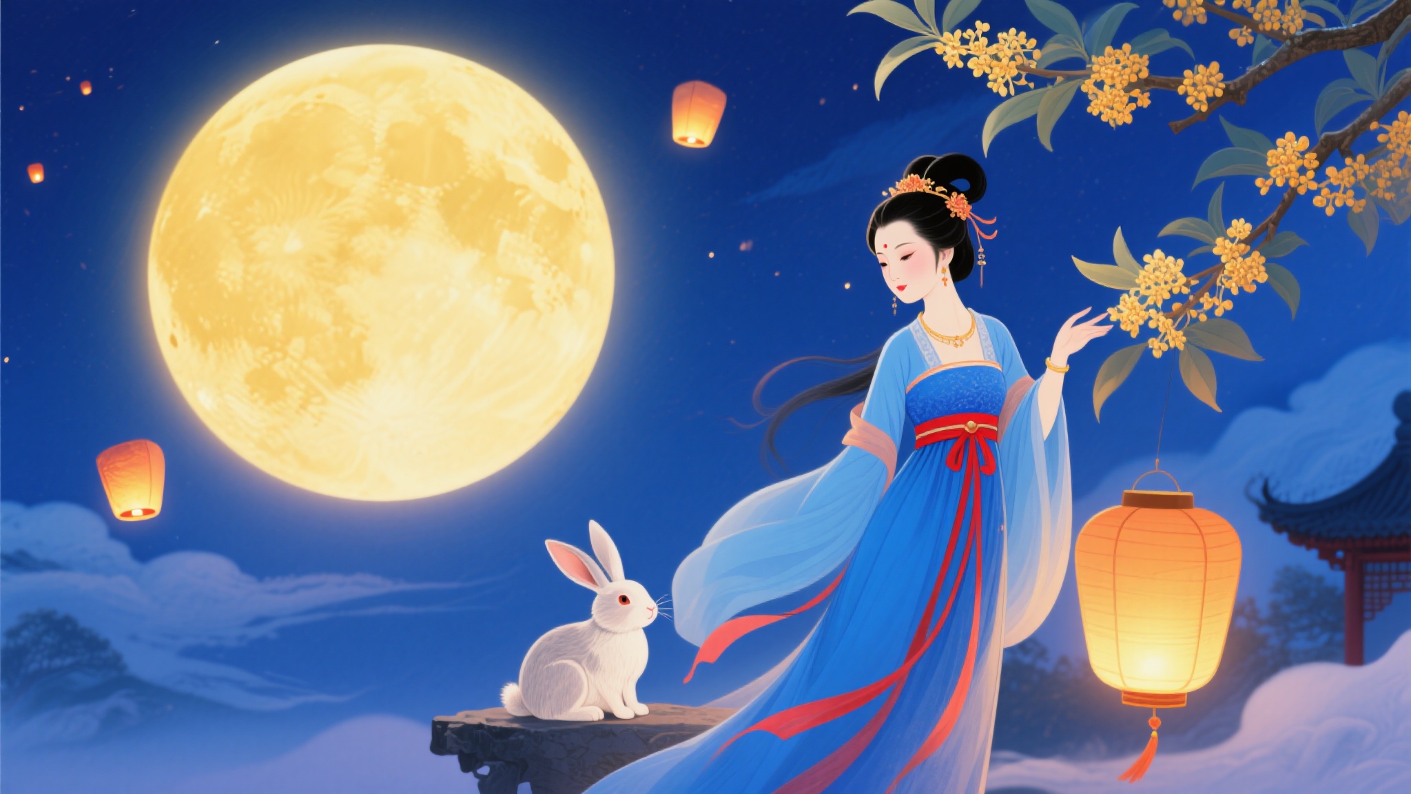 作品描述:中秋月夜图,幽蓝夜空(流云轻柔,孔明灯如萤火),圆月硕大(暖黄色,边缘有光晕渐变),嫦娥的蓝裙飘逸(红色腰带与丝带增添灵动),桂花树枝繁花盛(花朵鲜活,仿佛能闻到桂花香),玉兔神态温顺,宫灯散发暖光,整体画面静谧美好,尽显中秋传统意境。