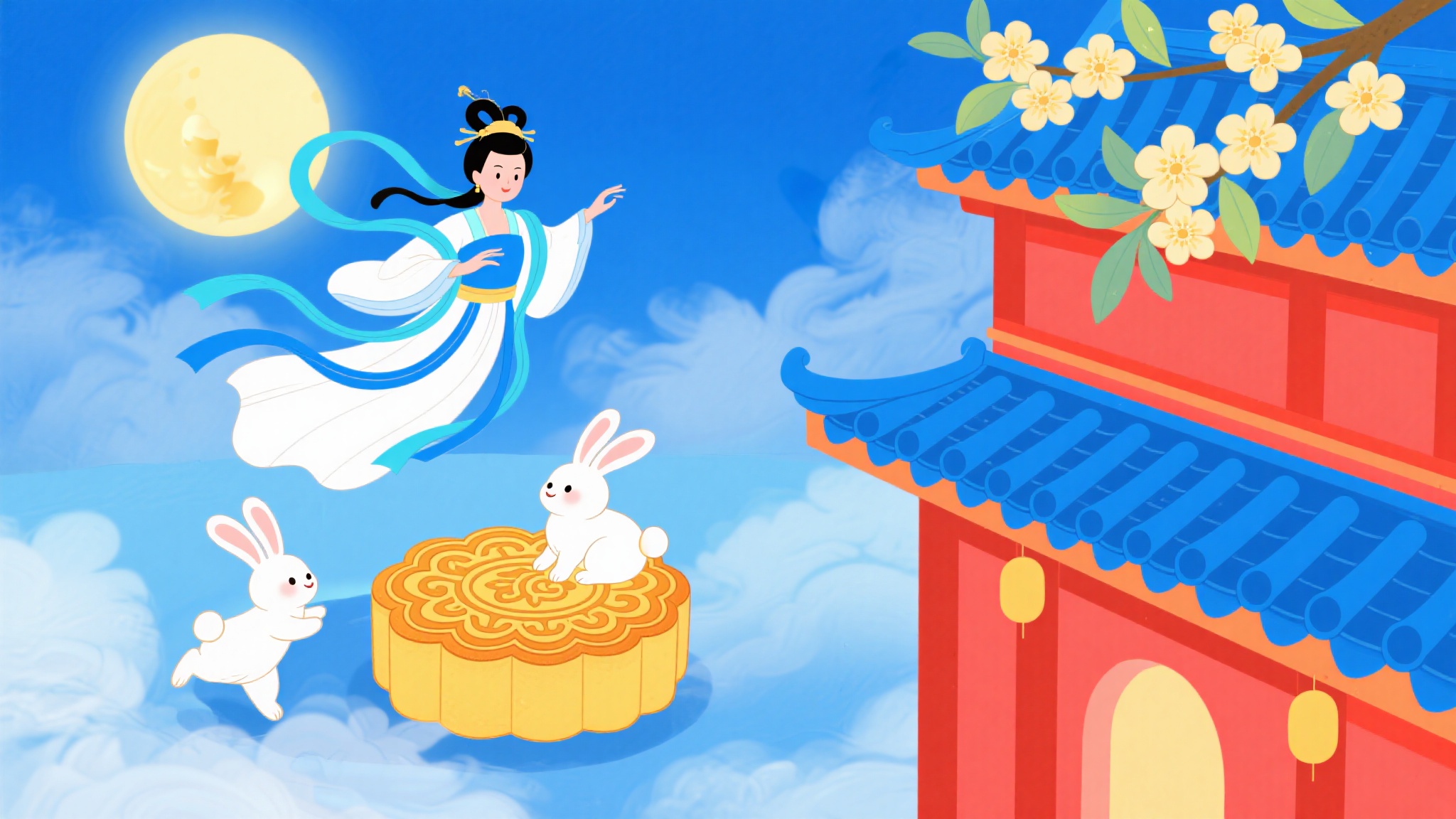 作品描述:中秋童趣插画,蓝青色天空(带有朦胧的云雾感),嫦娥衣袂飘飘(蓝白服饰,丝带灵动),下方白兔活泼可爱(一只坐月饼上,一只似在跳跃),月饼造型精致(花纹清晰,色泽金黄),古建色彩鲜艳(红墙蓝瓦对比鲜明),桂花枝花朵娇俏,整体画面充满童趣与中秋欢乐感。