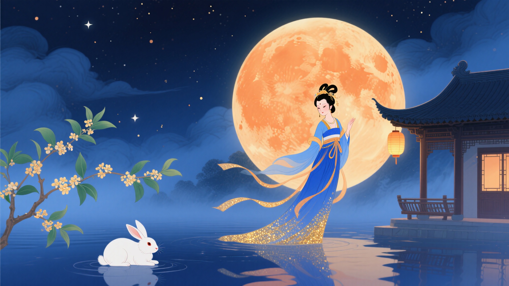 作品描述:中秋古典插画,墨蓝色夜空(云雾如轻纱,星光稀疏),圆月硕大(暖橙色,光晕柔和),嫦娥的蓝裙飘逸(裙摆带金色细闪,丝带灵动),桂花枝花朵小巧精致(叶片翠绿,与月光相映),白兔姿态慵懒,古建在夜色中古朴典雅(灯笼散发的光柔和朦胧),水面如镜,营造出古典雅致的中秋夜景。