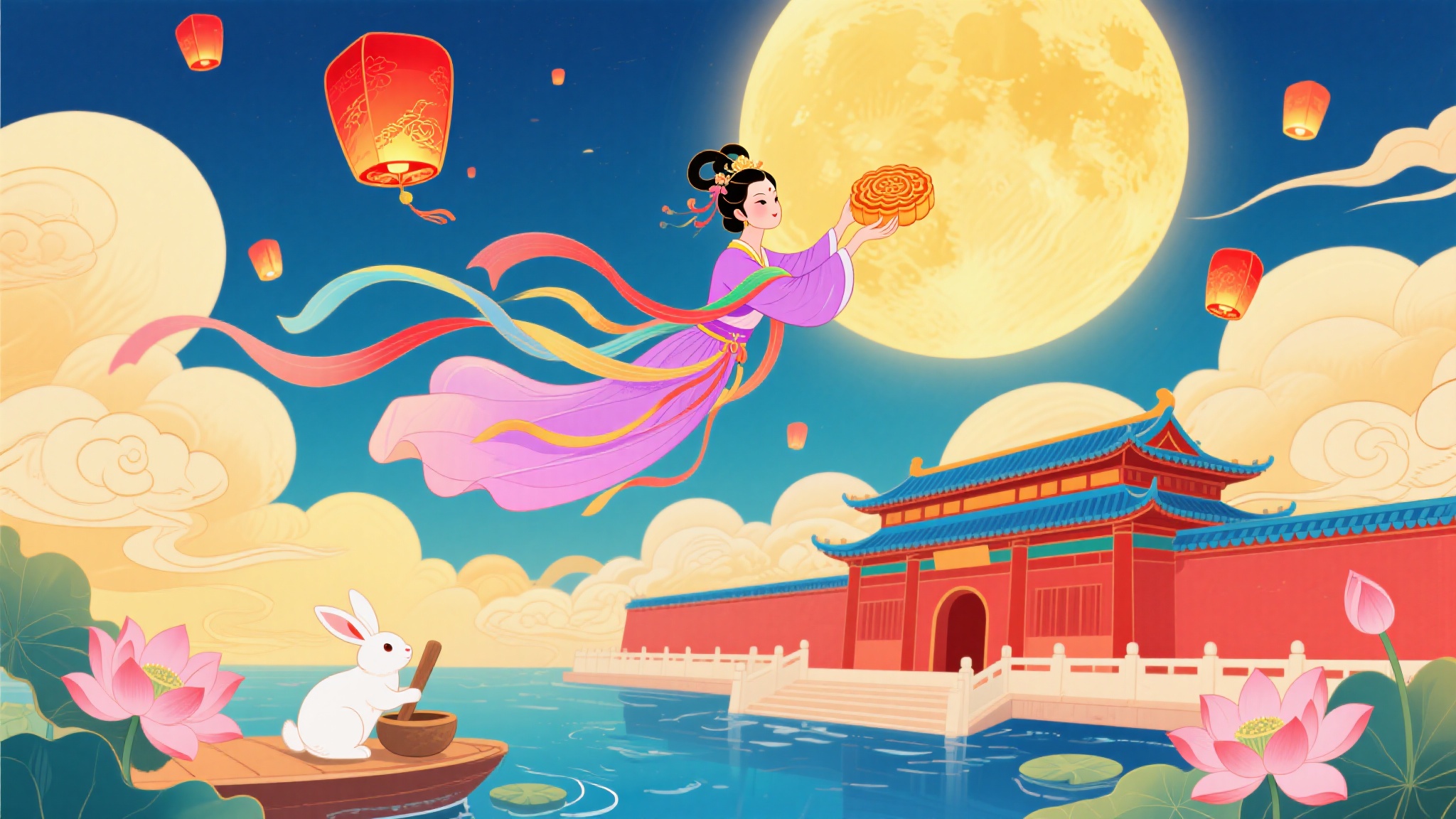 作品描述:中秋喜庆插画,暖黄色调天空(云朵如棉,光芒柔和),嫦娥穿粉紫古风长裙(丝带色彩斑斓,随风飞舞),手持月饼飞于空中,周围孔明灯(红色,造型精美)与祥云点缀,下方古建色彩鲜艳(红墙蓝瓦,层次分明),白兔在水边捣药,荷花盛开,整体氛围热烈喜庆,充满中秋欢乐气息。