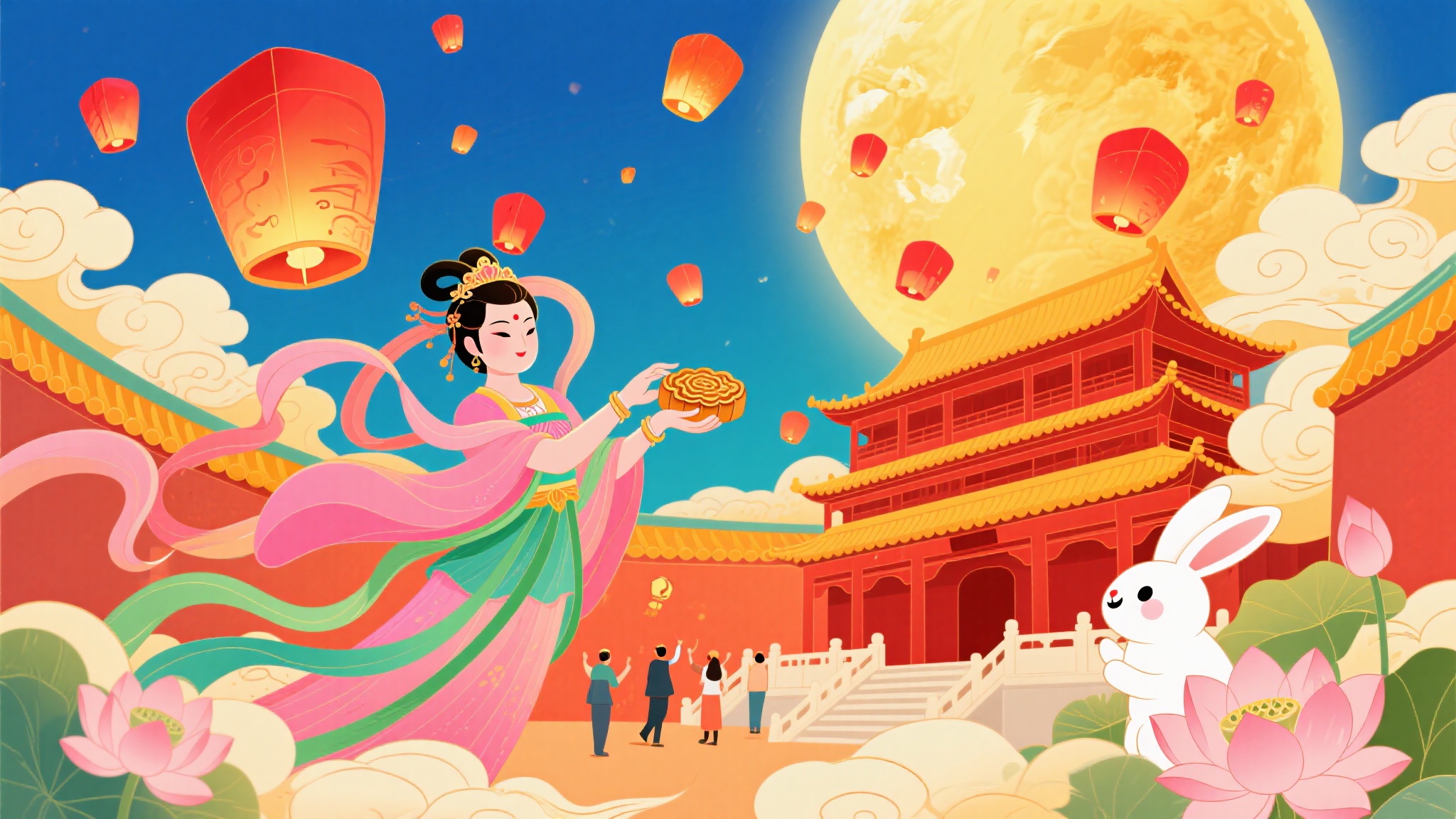 作品描述:中秋热闹场景插画,橙黄色天空(阳光般的暖色调,云朵轻盈),嫦娥服饰色彩绚丽(粉绿相间,丝带飘逸),手托月饼,孔明灯漫天飞舞(红色为主,形态各异),古建宏伟(红墙黄瓦,细节丰富),白兔活泼可爱,荷花与祥云装饰画面,营造出热闹欢快的中秋氛围