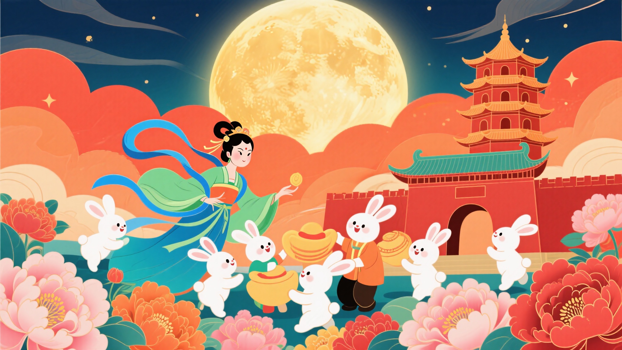 作品描述:中秋童趣团圆插画,橙红色天空(圆月如金盘,光晕温暖),嫦娥的绿蓝服饰(丝带灵动,充满活力),白兔们造型可爱(动作各异,神态活泼),牡丹花海(色彩丰富,花朵硕大),古建精巧(红墙宝塔,细节生动),营造出充满童趣的中秋团圆氛围。