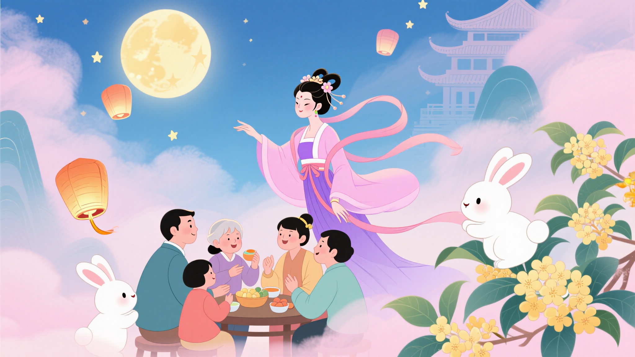 作品描述:中秋温馨插画,粉蓝调天空(云雾朦胧,孔明灯如星),嫦娥的粉紫服饰(丝带灵动,发饰可爱),家庭团圆场景(人物互动自然,氛围温馨),白兔造型萌趣(姿态各异),桂花繁茂(花朵金黄,叶片翠绿),背景仙宫若隐若现,营造出中秋的温馨氛围。