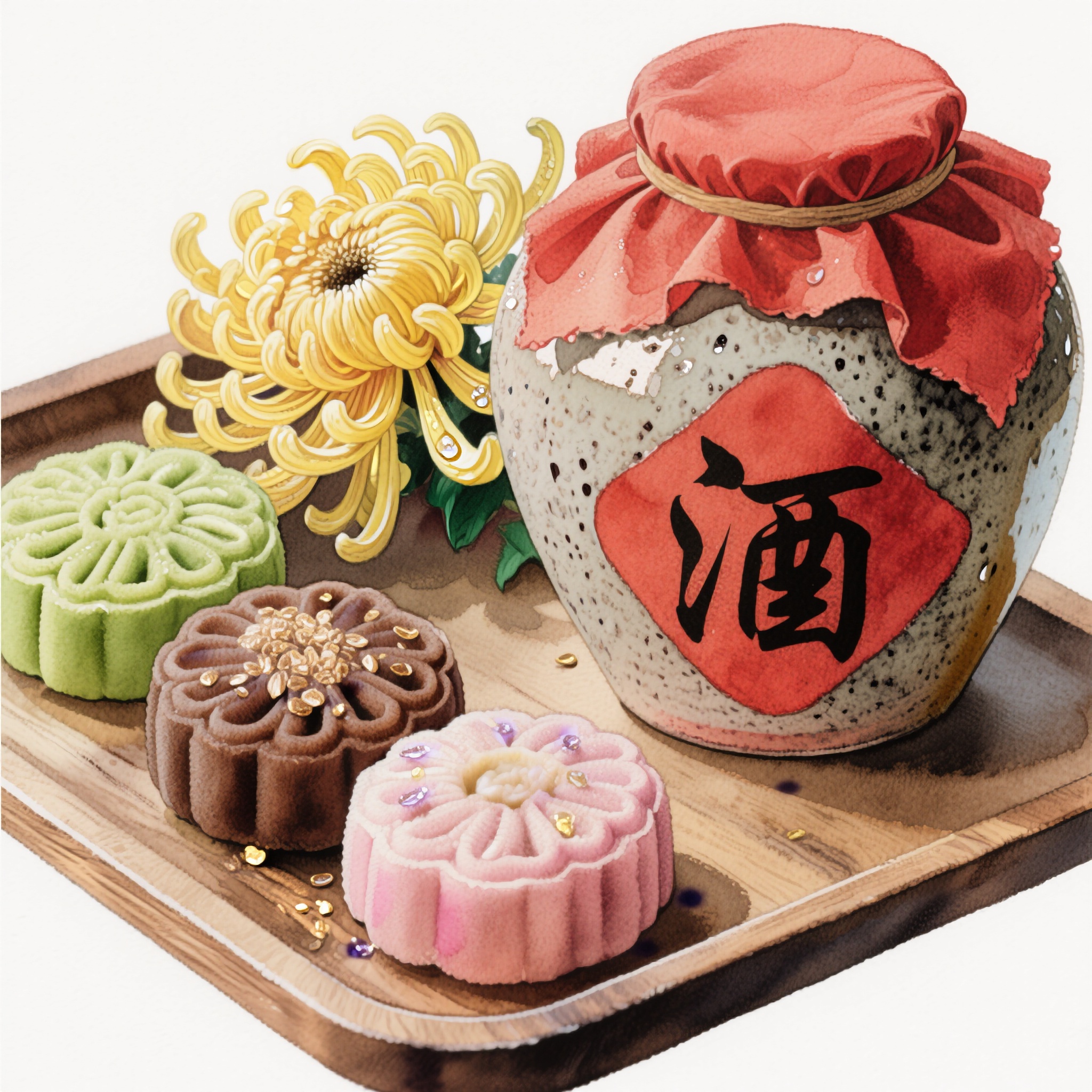 作品描述:写实水彩风格,木托盘上摆着陶酒坛(坛身 “酒” 字笔触苍劲,红布封口带褶皱)、三色糕点(绿粉棕,表面撒金粒),旁侧金黄菊花(花瓣层叠带露水)。优化细节:陶坛的粗陶颗粒感、糕点的绵密质感、菊花花瓣的水彩晕染层次。