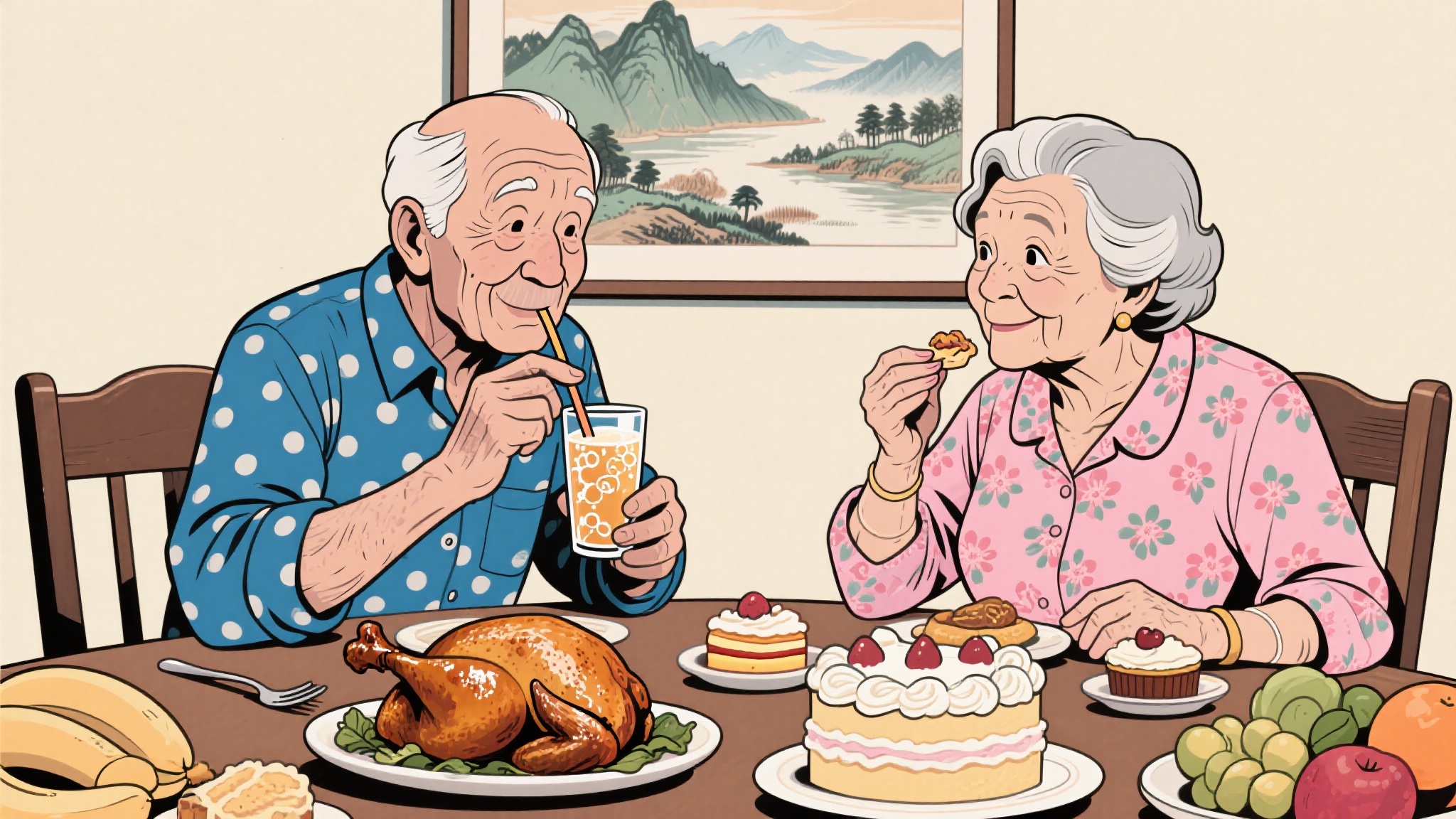 作品描述:复古漫画风格,老年夫妇在餐桌前共享美食,爷爷穿蓝波点衬衫喝带吸管的饮品,奶奶穿粉花上衣吃点心,桌上有烤鸡、蛋糕、水果,背景墙挂山水版画。优化细节:烤鸡的焦香表皮(油光纹理)、蛋糕的奶油裱花(立体蓬松)、饮品的气泡感(透明液体)。