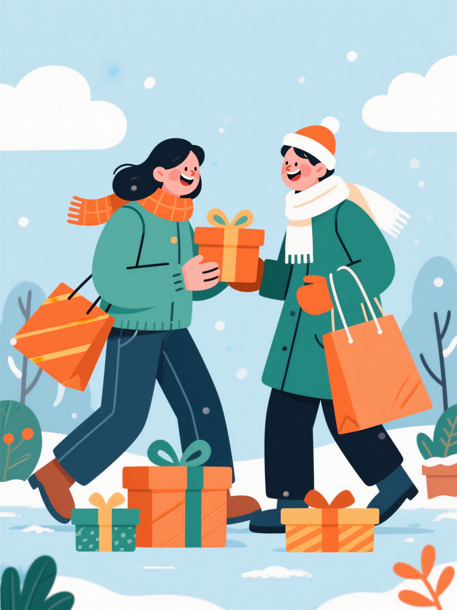作品描述:8k超清卡通插画,主色调为浅蓝色、橙色和绿色,整体配色明亮和谐。画面中有两位成年人物,表情愉悦,动作轻快,穿着冬季服装,互动亲密,共同展示礼物和购物袋。主要物体为礼物盒和购物袋,场景为户外,物体摆放于人物手中和周围,空间关系紧密。场景氛围欢乐,环境特点为节日购物。装饰性元素包括云朵和植物,背景设计简洁,处理方式为平面化。整体视觉效果生动,传达的情感为欢乐和温馨的节日购物体验。