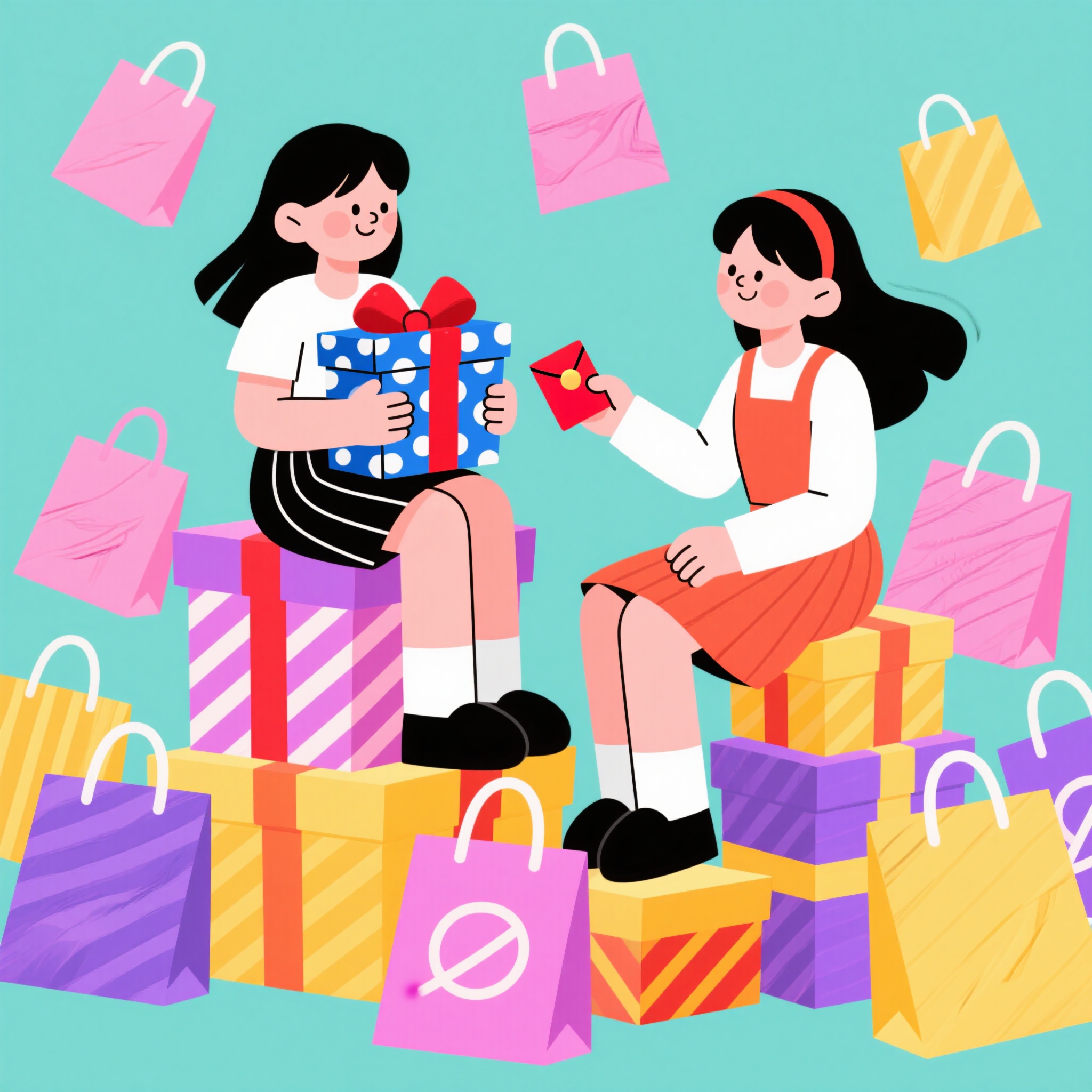 作品描述:清新卡通风格,两位女孩与礼物互动,一位坐礼物堆上抱红蓝礼盒(礼盒表面有波点 / 条纹纹理),另一位坐礼盒上递红包,周围散落多彩购物袋(粉 / 紫 / 黄配色,袋身有简约图案)。优化细节:礼物盒的纹理层次、购物袋的褶皱动态、人物的神态生动度。