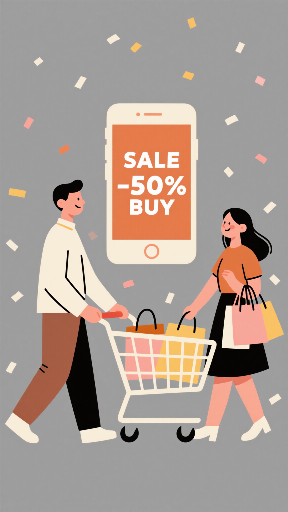作品描述:促销活动宣传插画,一对男女购物场景,男士推购物车拉女士,女士满载购物袋,手机屏幕显示“SALE -50% BUY”,扁平插画风格,简洁构图,暖色调,背景点缀飘落纸屑。画面背景灰色