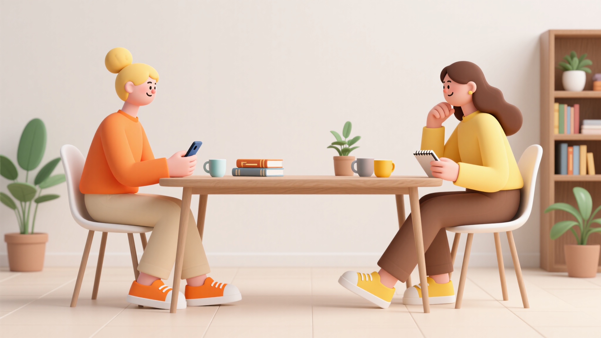 作品描述:8k超清简约卡通插画,画面中央一张桌子,桌子两侧各坐一位成年人物。左侧人物金发丸子头,穿着橙色上衣和米色裤子,脚穿橙色鞋子,手持手机和杯子,表情专注。右侧人物棕色长发,穿着黄色上衣和棕色裤子,脚穿黄色鞋子,手持杯子和笔记本,表情思考。桌上摆放书本和杯子,椅子分置两侧,植物点缀在桌子和书架上,书架靠墙放置。背景为浅色墙面和地面,整体环境整洁明亮,氛围温馨,视觉效果温馨舒适,传达轻松愉快的交流氛围。