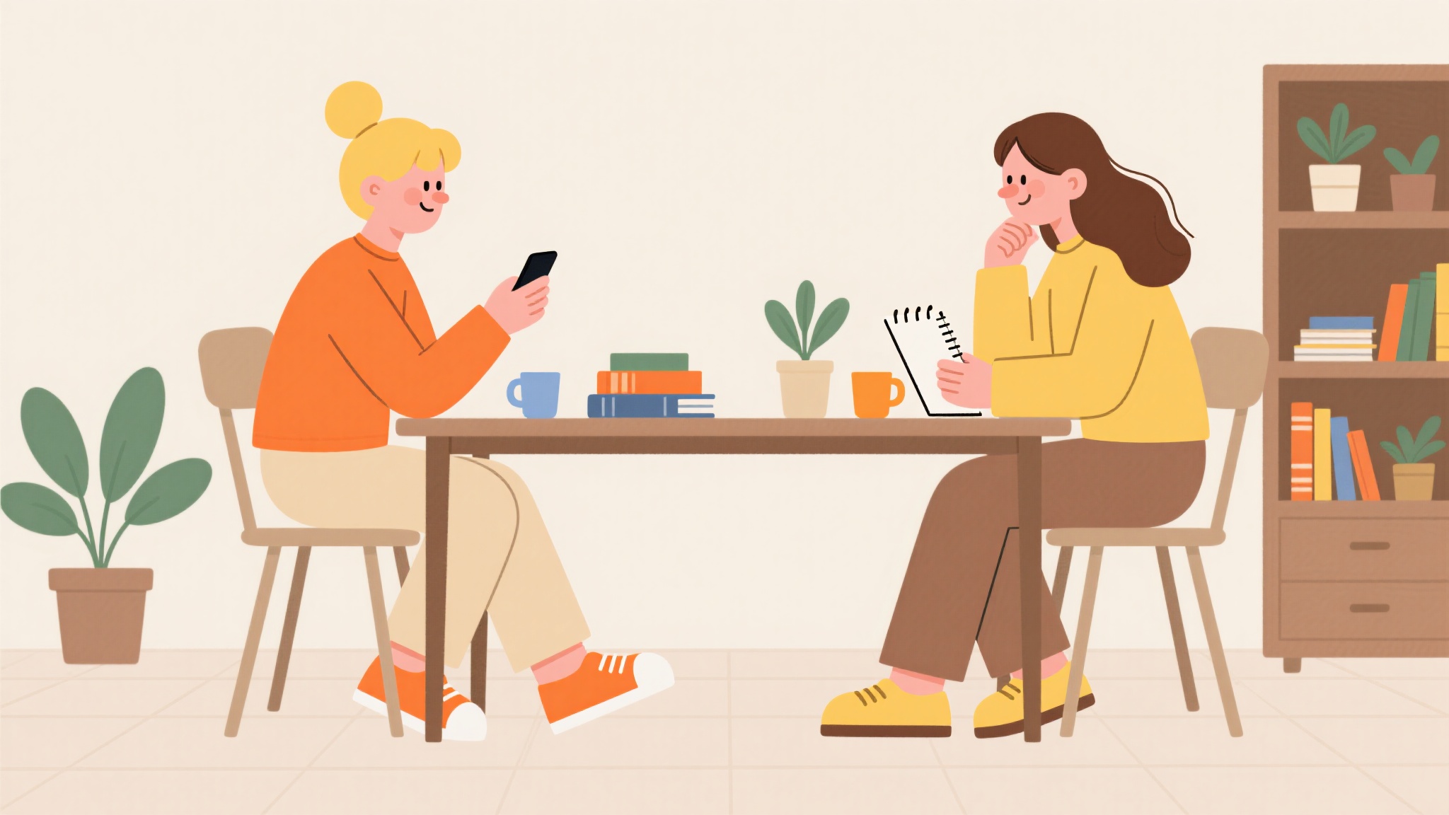 作品描述:简约卡通插画,画面中央一张桌子,桌子两侧各坐一位成年人物。左侧人物金发丸子头,穿着橙色上衣和米色裤子,脚穿橙色鞋子,手持手机和杯子,表情专注。右侧人物棕色长发,穿着黄色上衣和棕色裤子,脚穿黄色鞋子,手持杯子和笔记本,表情思考。桌上摆放书本和杯子,椅子分置两侧,植物点缀在桌子和书架上,书架靠墙放置。背景为浅色墙面和地面,整体环境整洁明亮,氛围温馨,视觉效果温馨舒适,传达轻松愉快的交流氛围。