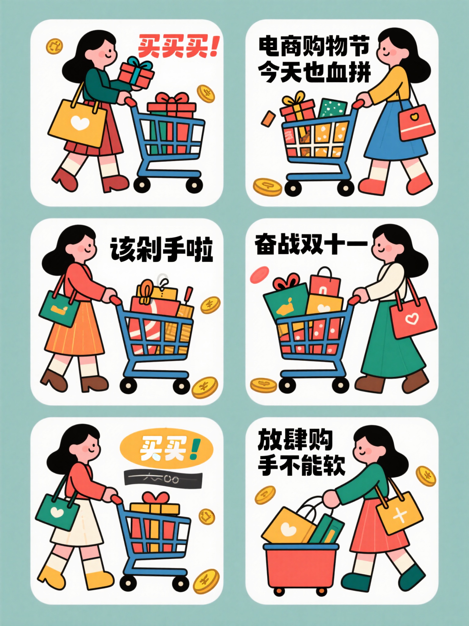 作品描述:电商购物节宣传主题插画, 六个不同购物场景,多组女性购物场景, 有推购物车、手拿礼物、大包小包满载等, “买买买”“今天也血拼”“该剁手啦”“奋战双十一”“放肆购”“手不能软”, 可爱卡通风格, 正方形构图, 背景简洁干净, 点缀金币等元素
