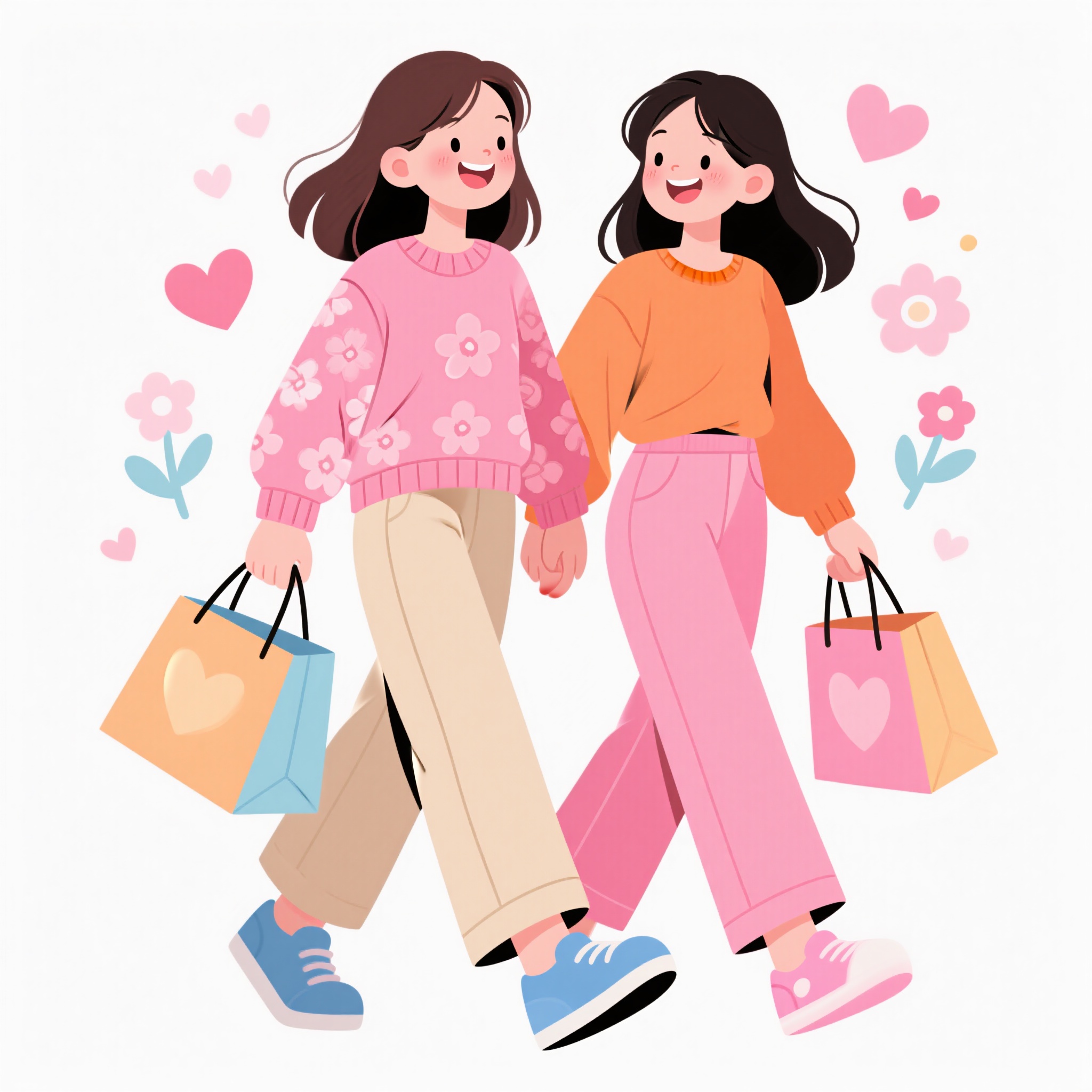 作品描述:8k超清插画,卡通风格,主色调为粉色、橙色和浅蓝色,整体配色方案柔和温馨。画面中有两位年轻女性人物,左边人物微笑,手持购物袋,穿着粉色花纹毛衣、米色裤子和蓝色鞋子;右边人物微笑,手持购物袋,穿着橙色上衣、粉色裤子和粉色鞋子。两人并肩行走,显得亲密友好。背景白色,无具体设计,装饰性元素包括心形图案和花朵图案。整体视觉效果明亮愉快,传达出轻松愉悦的购物体验和友谊情感。