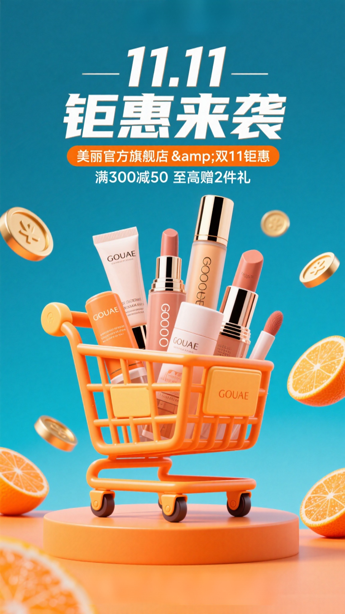 作品描述:双11美妆促销海报,主体为多款GOUAE品牌美妆产品,有购物车、金币、橘子点缀,文案“11.11 钜惠来袭 美丽官方旗舰店&双11钜惠 满300减50 至高赠2件礼 优惠丰厚 氛围热烈 更多惊喜福利,请进店了解!”,暖橙色系风格,中心构图,背景简洁明亮