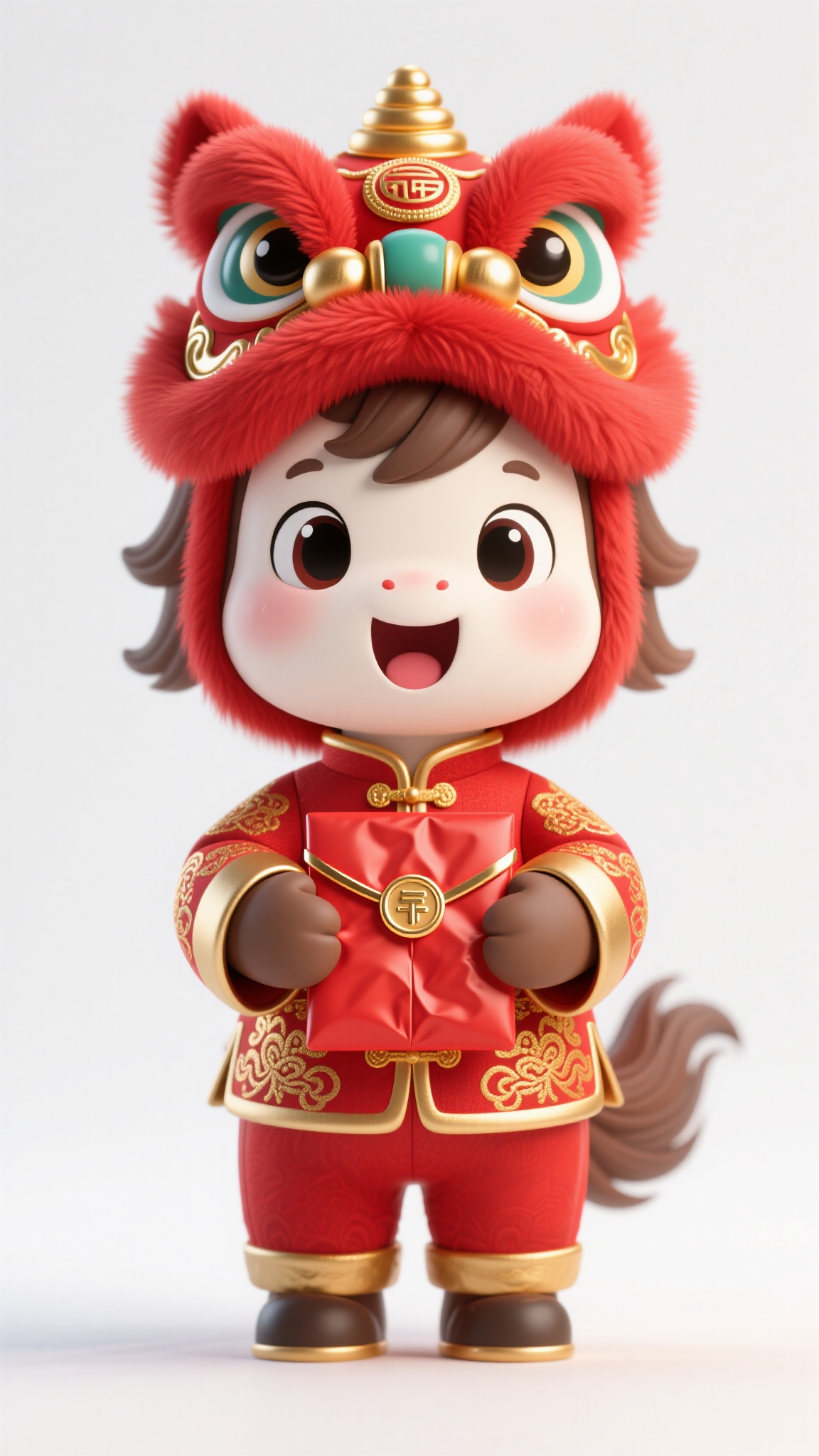 作品描述:Q 版卡通马,红金醒狮头套(立体萌趣、细节丰富),红底金绣中式服,双手抱红金利是红包(褶皱 + 金属封边),表情惊喜,3D 卡通风格,强调红包质感与 IP 可爱神态。画面背景白色