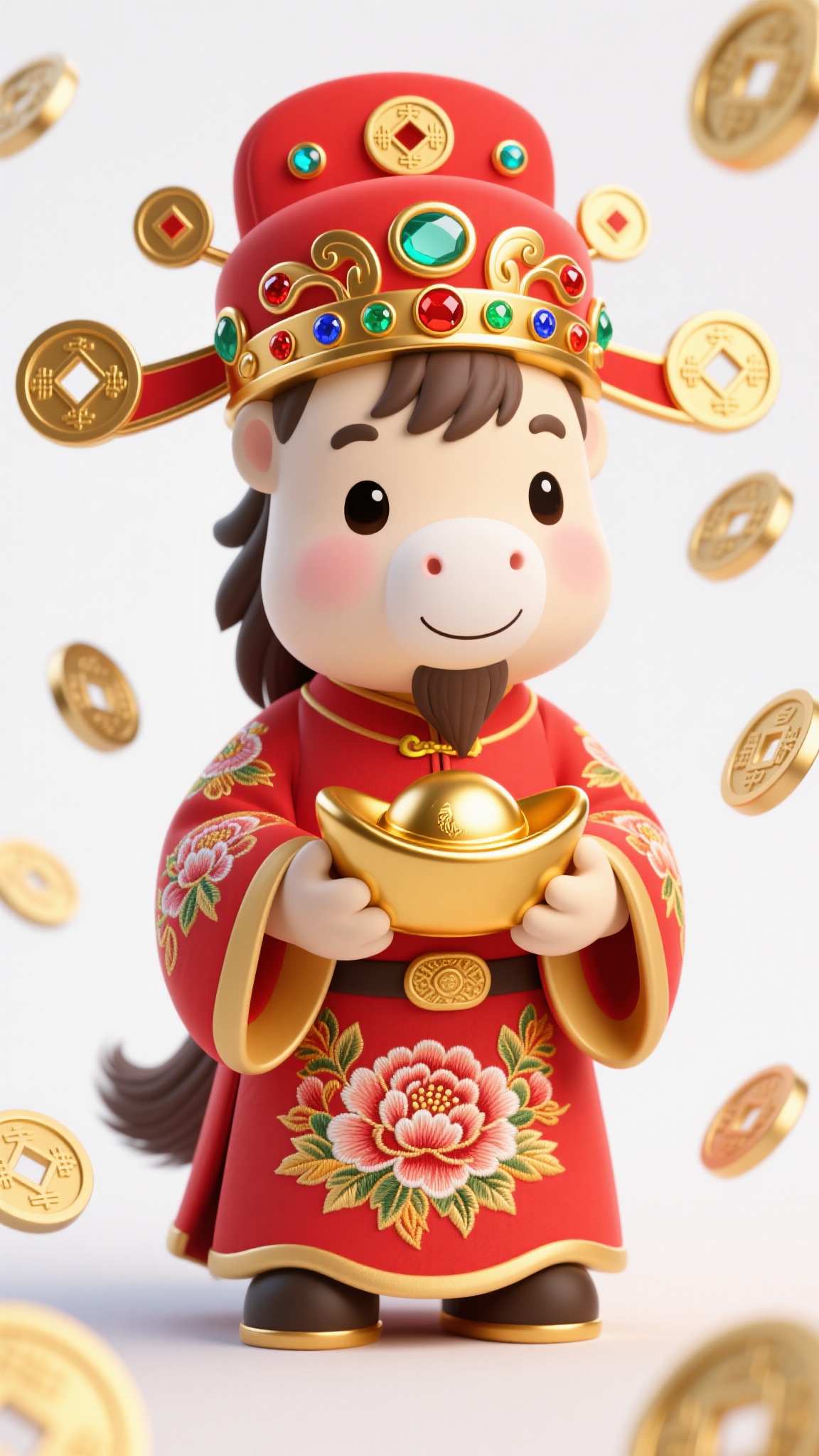 作品描述:Q 版卡通马,红金财神帽(嵌多色宝石、铜钱装饰),红袍绣金牡丹,双手捧金元宝,周围悬浮金铜钱(动态环绕),3D 卡通风格,突出牡丹刺绣精致与铜钱动感。画面背景白色
