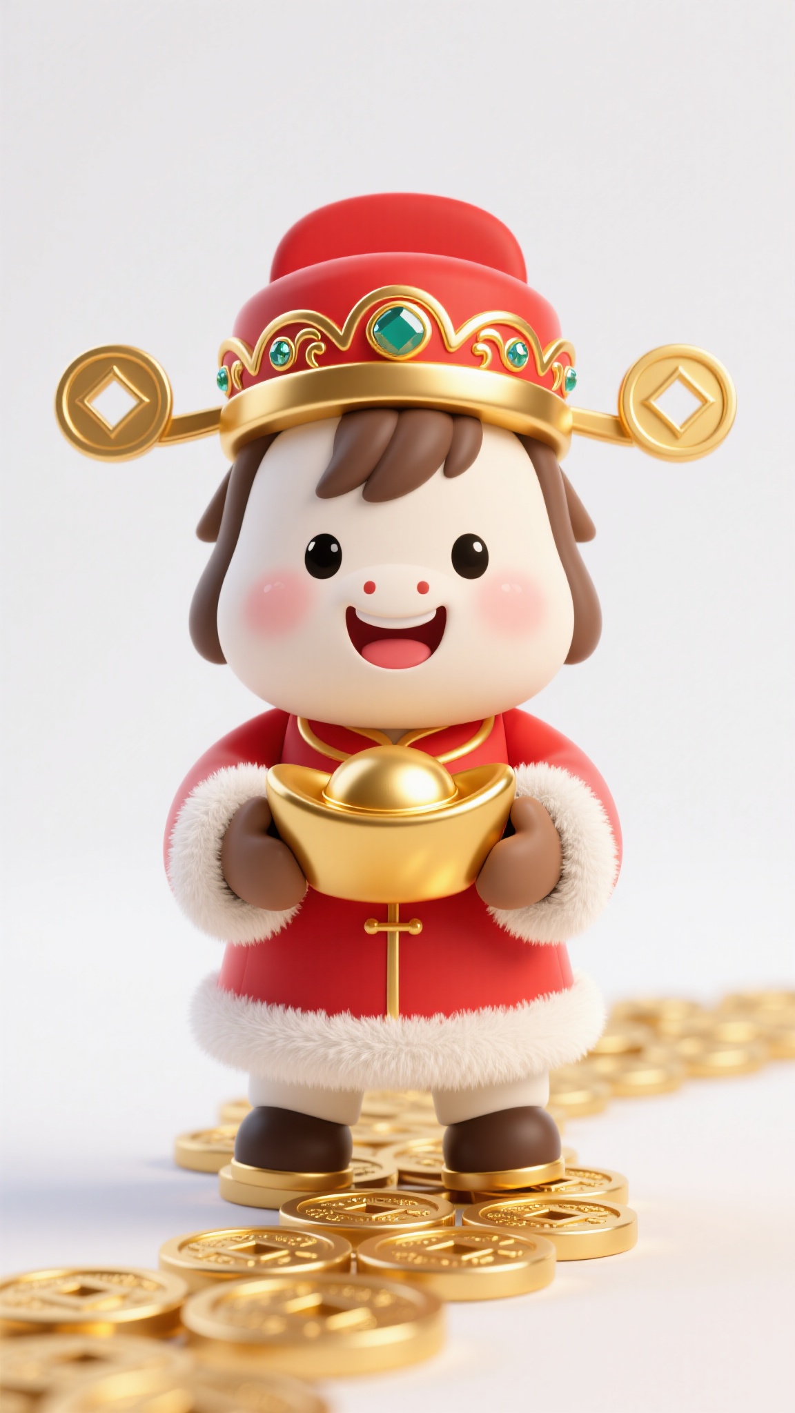作品描述:Q 版卡通马,戴红金财神帽(帽檐金纹、宝石点缀),红袍配白绒袖口,手持金元宝,脚踩金铜钱路(细节清晰),表情自信微笑,3D 卡通风格,突出铜钱路与毛绒袖口质感。画面背景白色