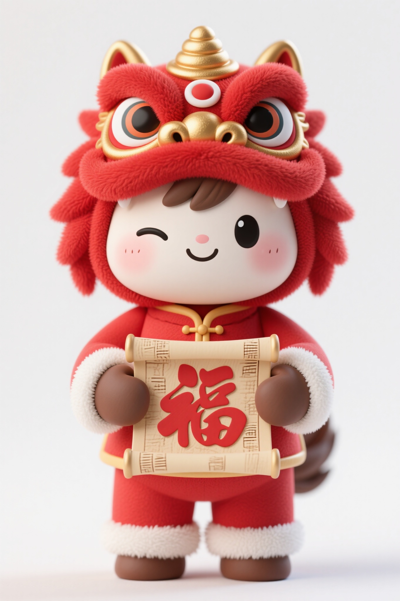 作品描述:Q 版卡通马,红金醒狮头套(大眼萌系,红绒质感),红中式连体衣(白绒袖口裤脚),双手抱红 “福” 字卷轴,表情俏皮眨眼,黏土风卡通,强调黏土的厚重质感与卷轴的纸质纹理。画面背景白色