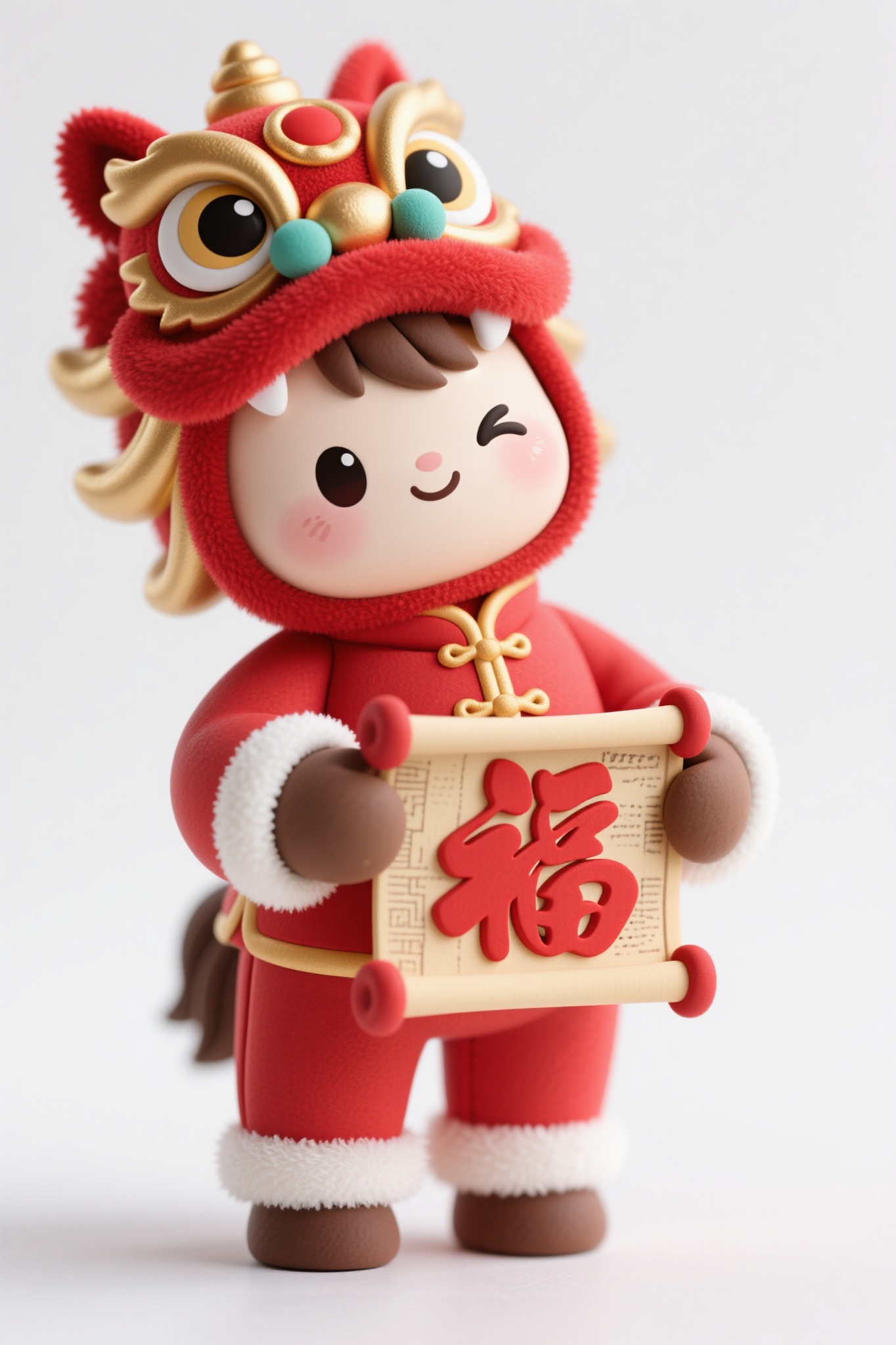 作品描述:Q 版卡通马,红金醒狮头套(大眼萌系,红绒质感),红中式连体衣(白绒袖口裤脚),双手抱红 “福” 字卷轴,表情俏皮眨眼,黏土风卡通,强调黏土的厚重质感与卷轴的纸质纹理。画面背景白色