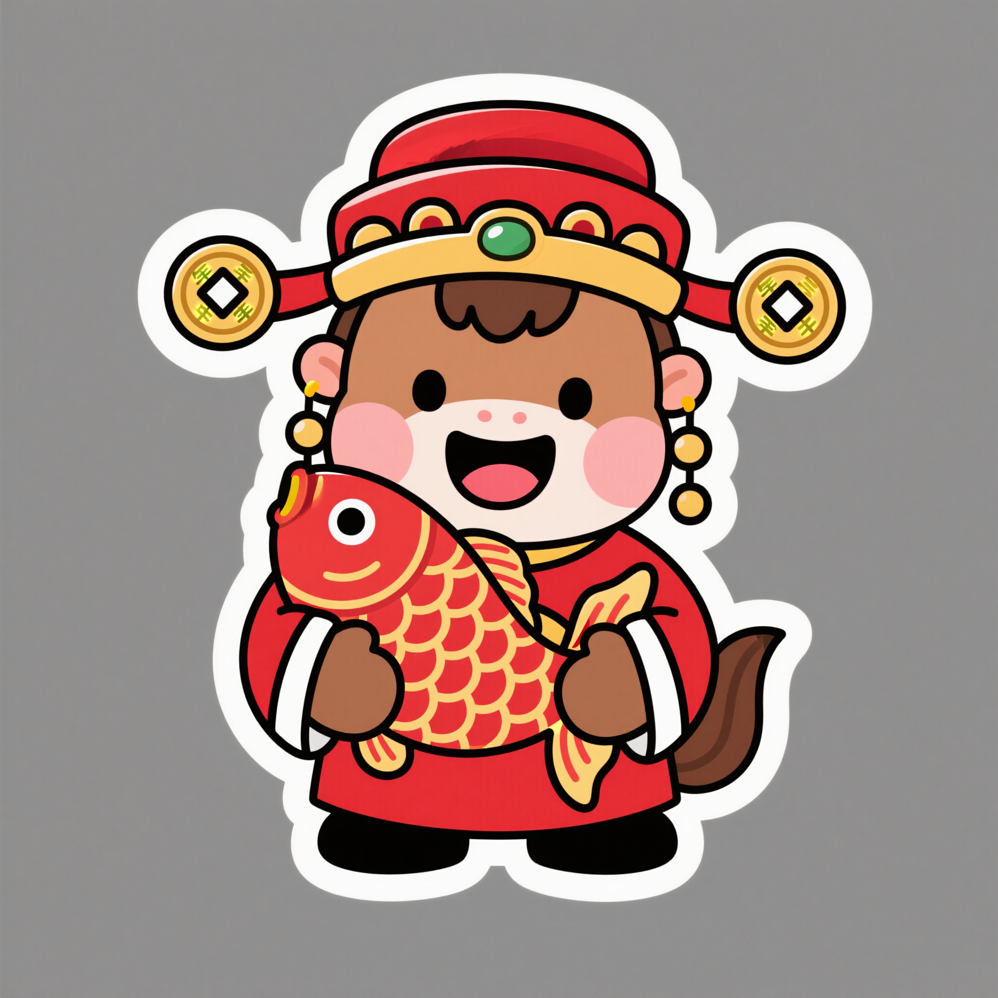 作品描述:Q 版卡通马,红金财神帽(铜钱耳饰,红绒顶),红袍金扣,双手抱红锦鲤(金鳞纹理,寓意年年有余),表情欢快,扁平插画风格,强调锦鲤的图案化与服饰的简洁线条。画面背景白色