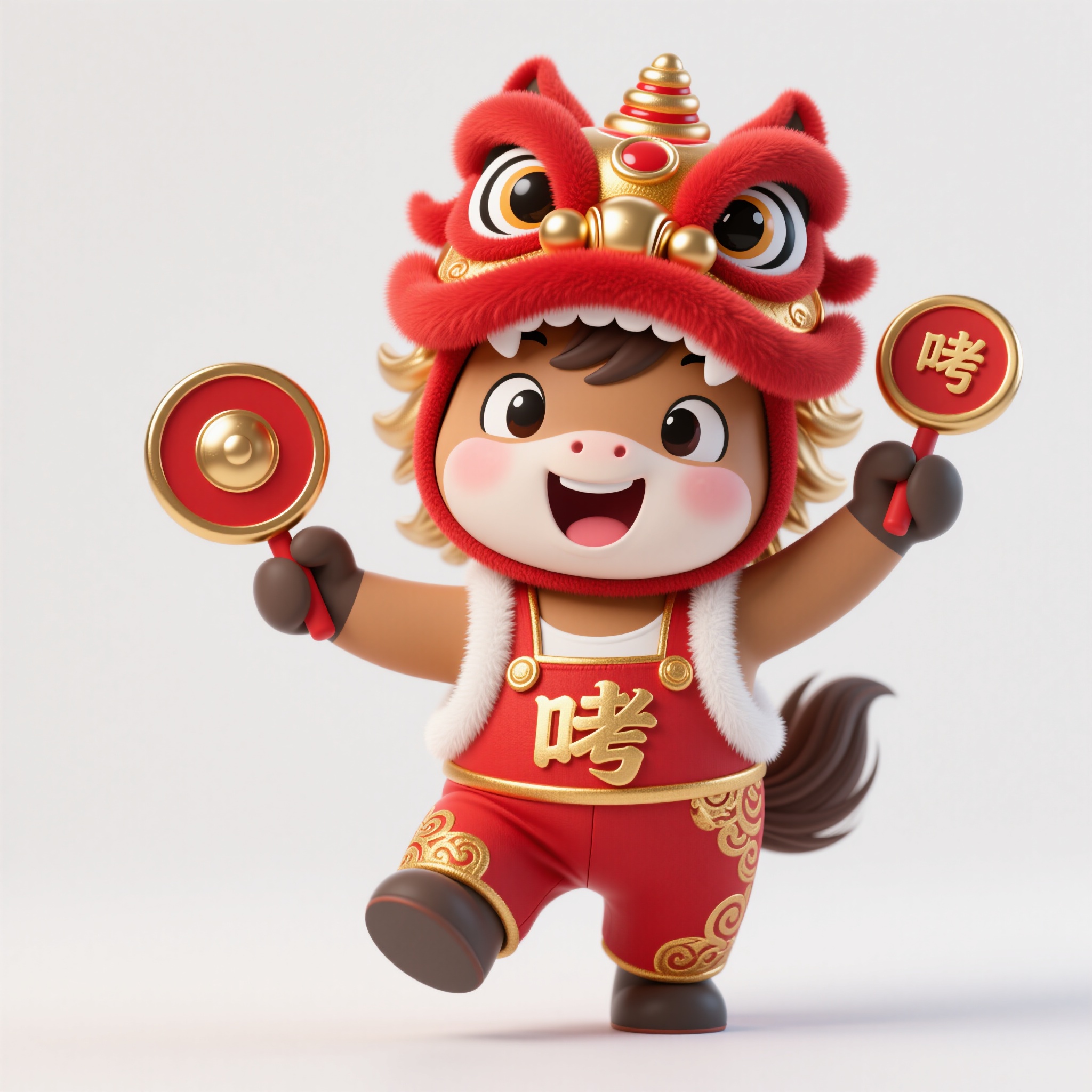 作品描述:Q 版卡通马,红金醒狮头套(夸张大眼,红绒立体),红金背带裤(金纹装饰,白绒肩带),双手举红金小锣(“哐” 字装饰,寓意热闹),表情兴奋,3D 卡通风格,强调锣的金属感与头套的夸张萌感。画面背景白色