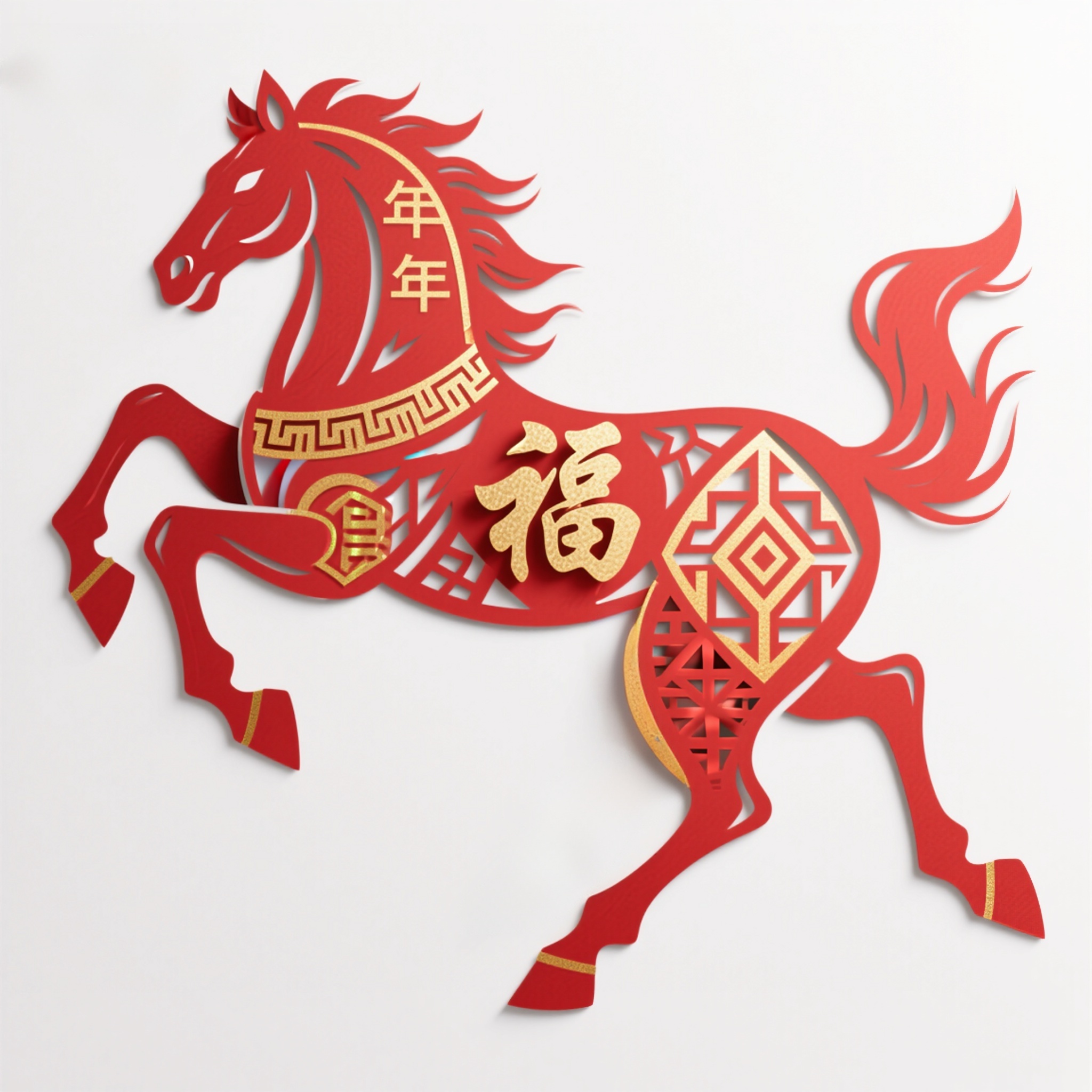 作品描述:剪纸风马年 IP,红金配色,马身饰“福”字与传统几何纹,奔腾姿态,剪纸镂空质感,线条简洁锐利,国风年味十足。画面背景白色