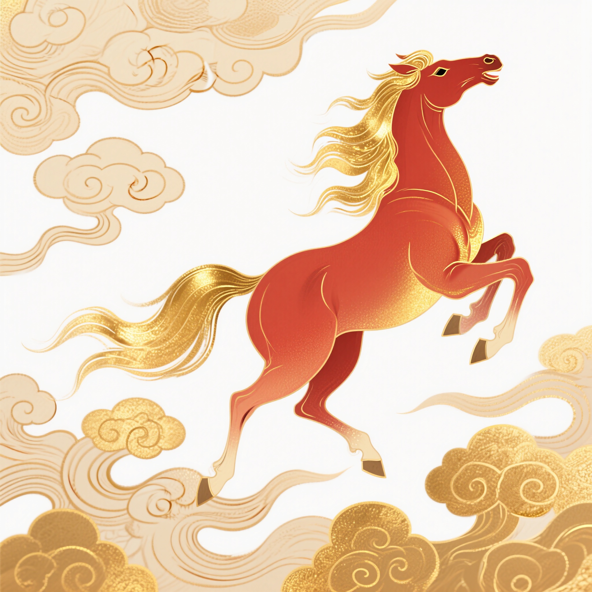 作品描述:国风跃起马,红金渐变马身,金鬃金尾踏金祥云,姿态昂扬,手绘国风风格,强调祥云纹理与马的矫健身姿。画面背景白色
