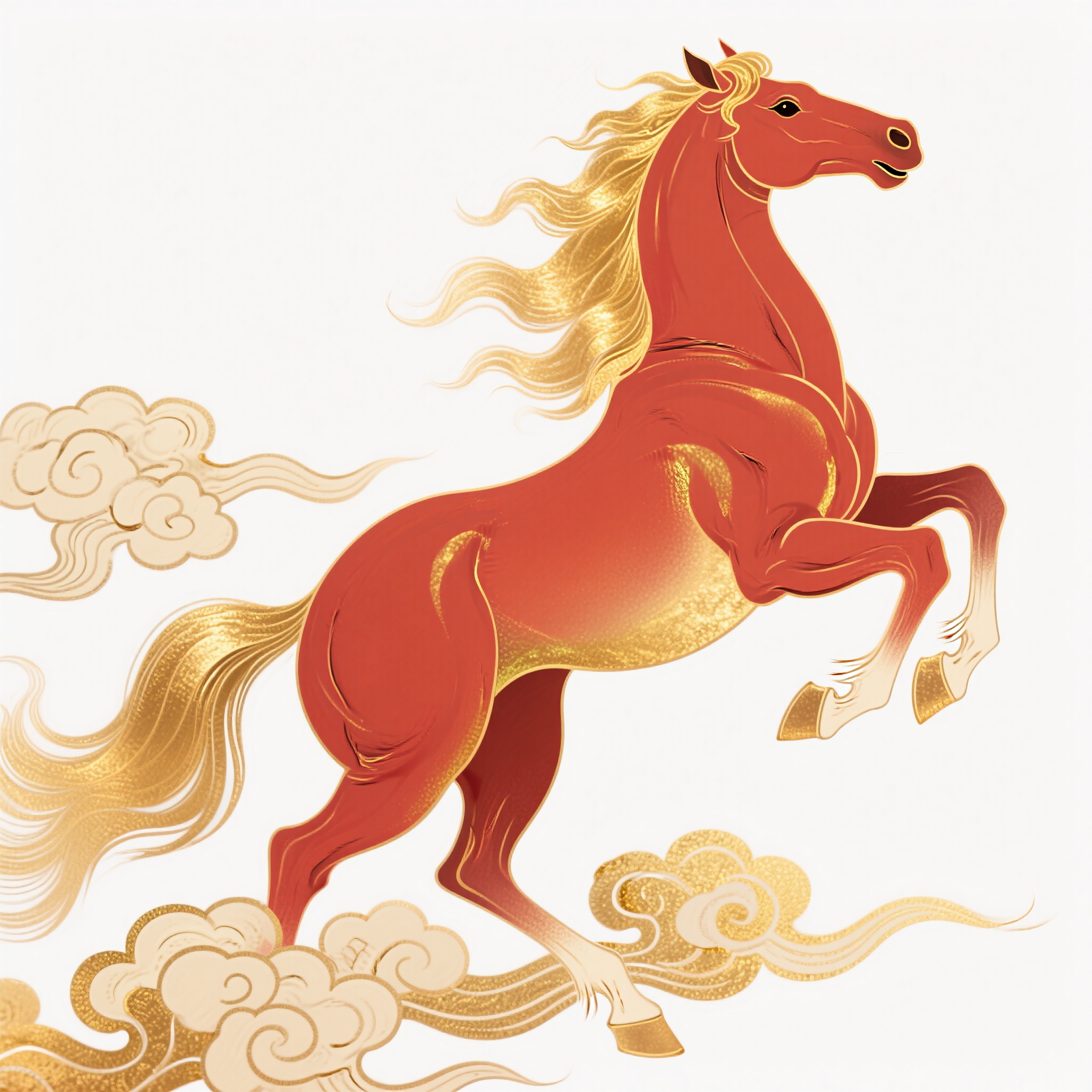 作品描述:国风跃起马,红金渐变马身,金鬃金尾踏金祥云,姿态昂扬,手绘国风风格,强调祥云纹理与马的矫健身姿。画面背景白色