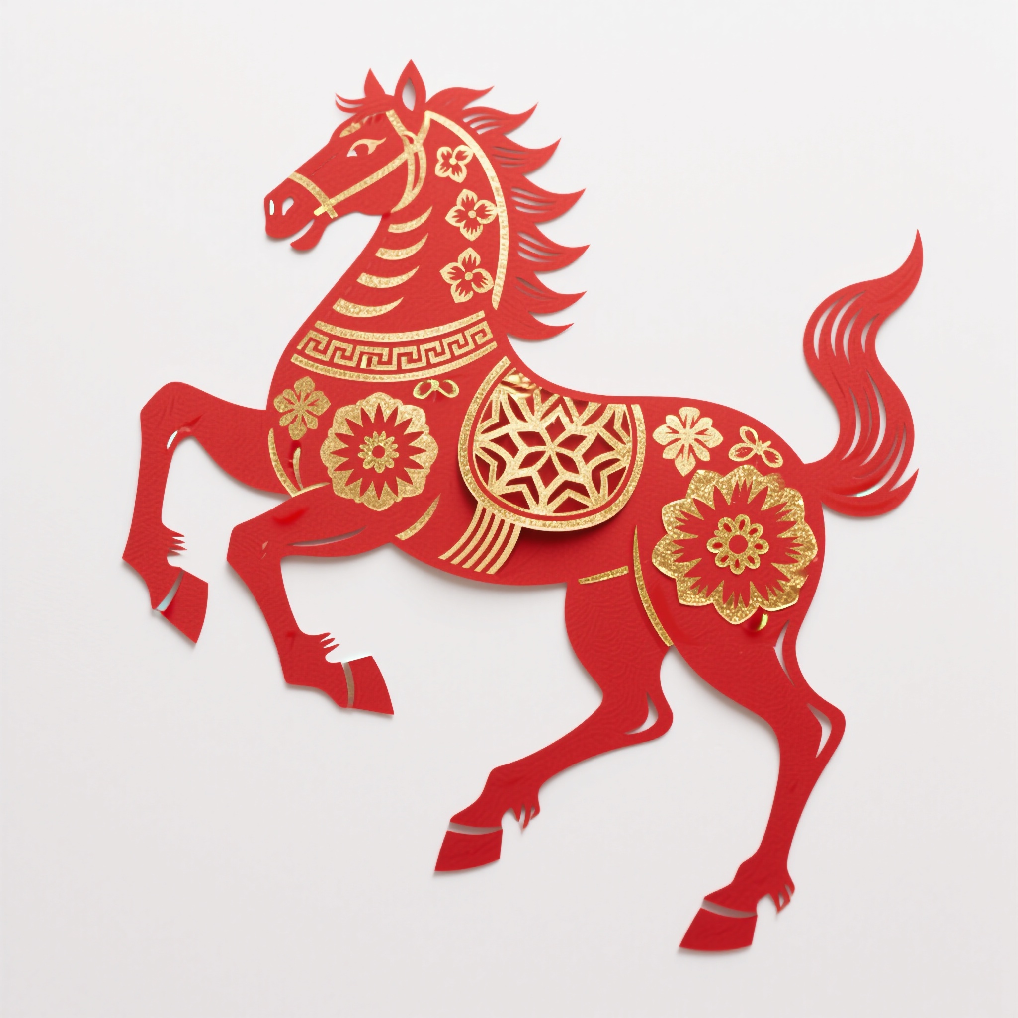 作品描述:红金剪纸马,马身饰金花纹 + 几何纹,前蹄跃起,剪纸纹样精致(忽略背景),传统年味十足。画面背景白色