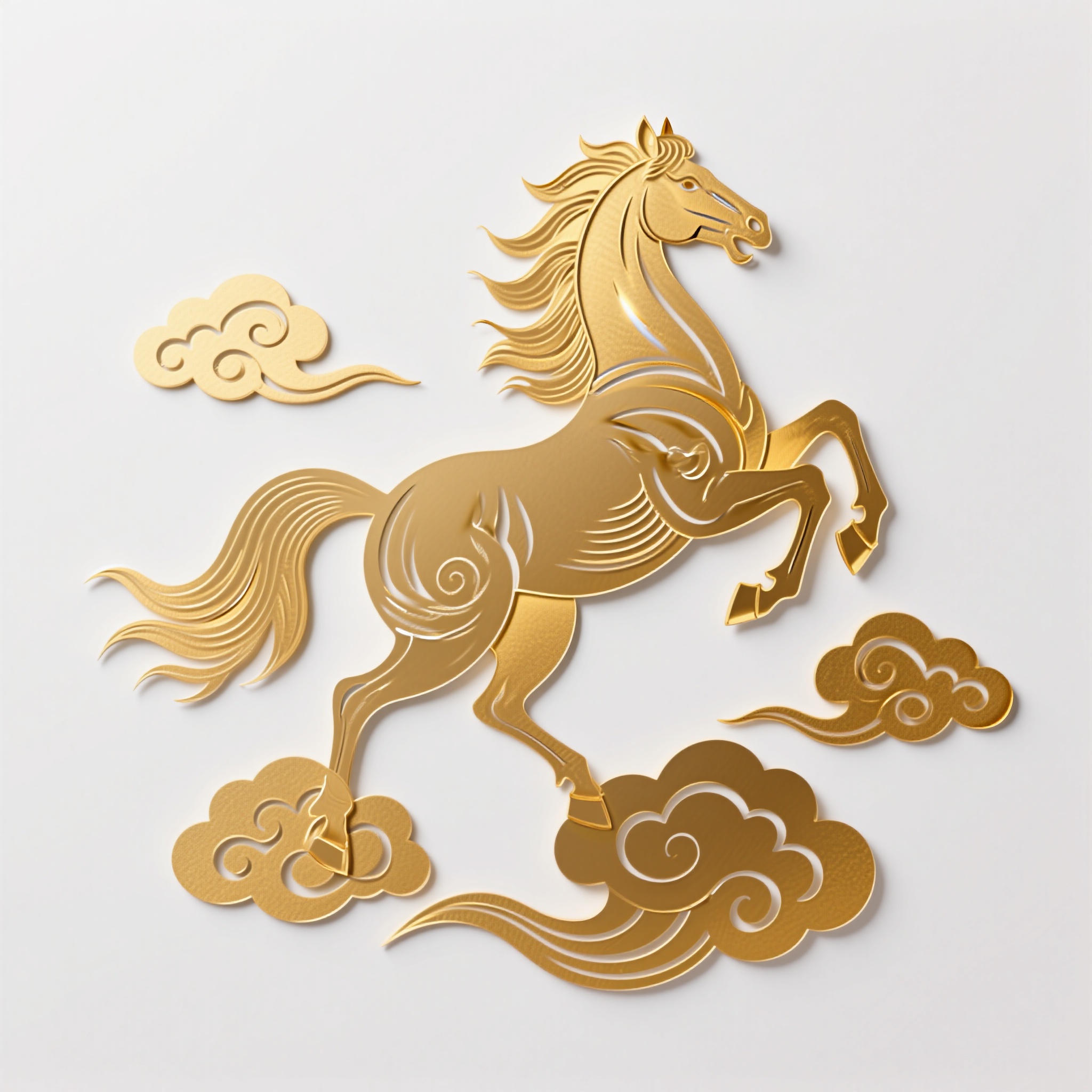 作品描述:金色祥云马,全金配色饰云纹,跃起姿态,金属剪纸质感,华贵大气,寓意马到成功。画面背景白色