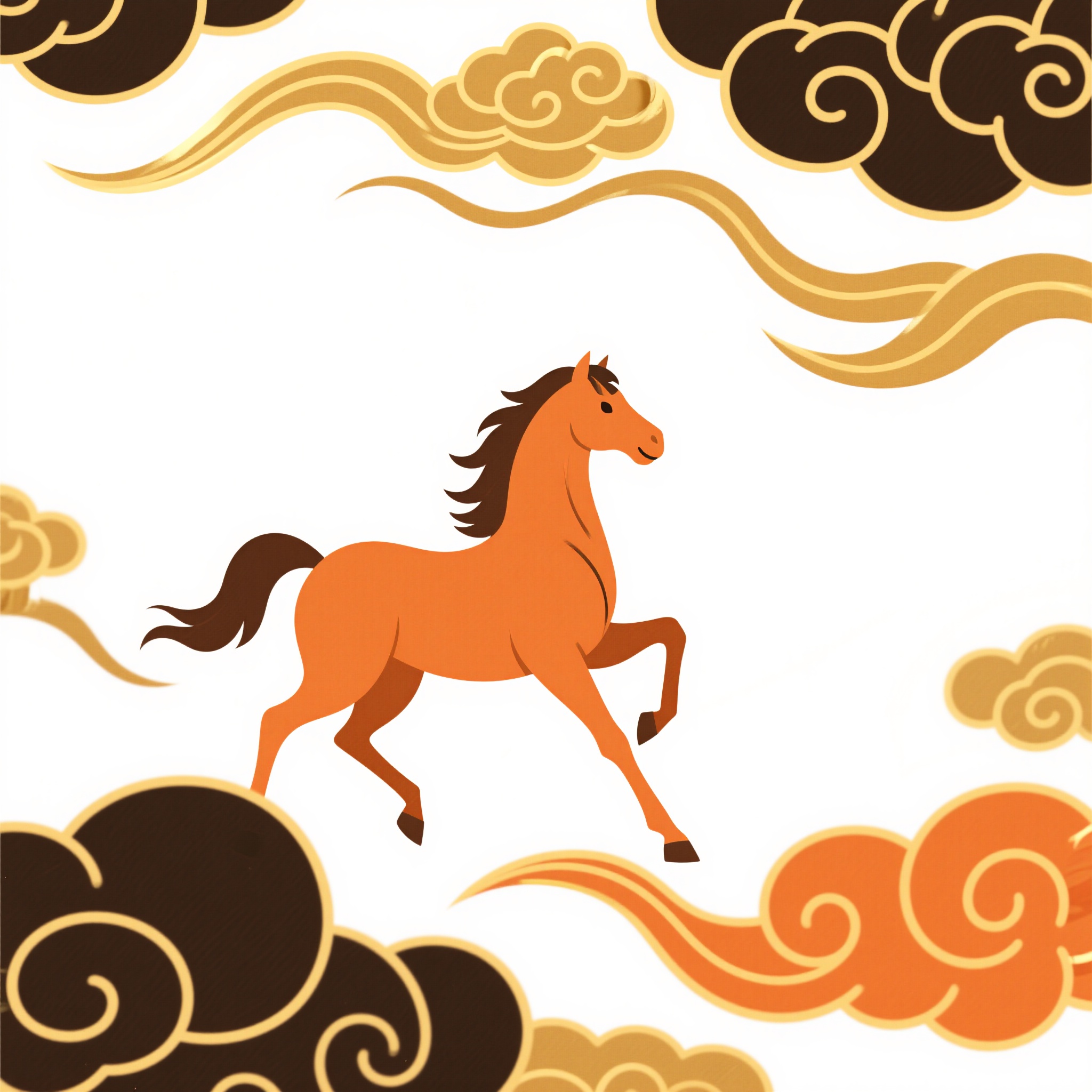 作品描述:动态祥云马,橙马饰金云纹,鬃尾飘动,迈步姿态,扁平插画,云纹流畅动感十足。 画面背景白色