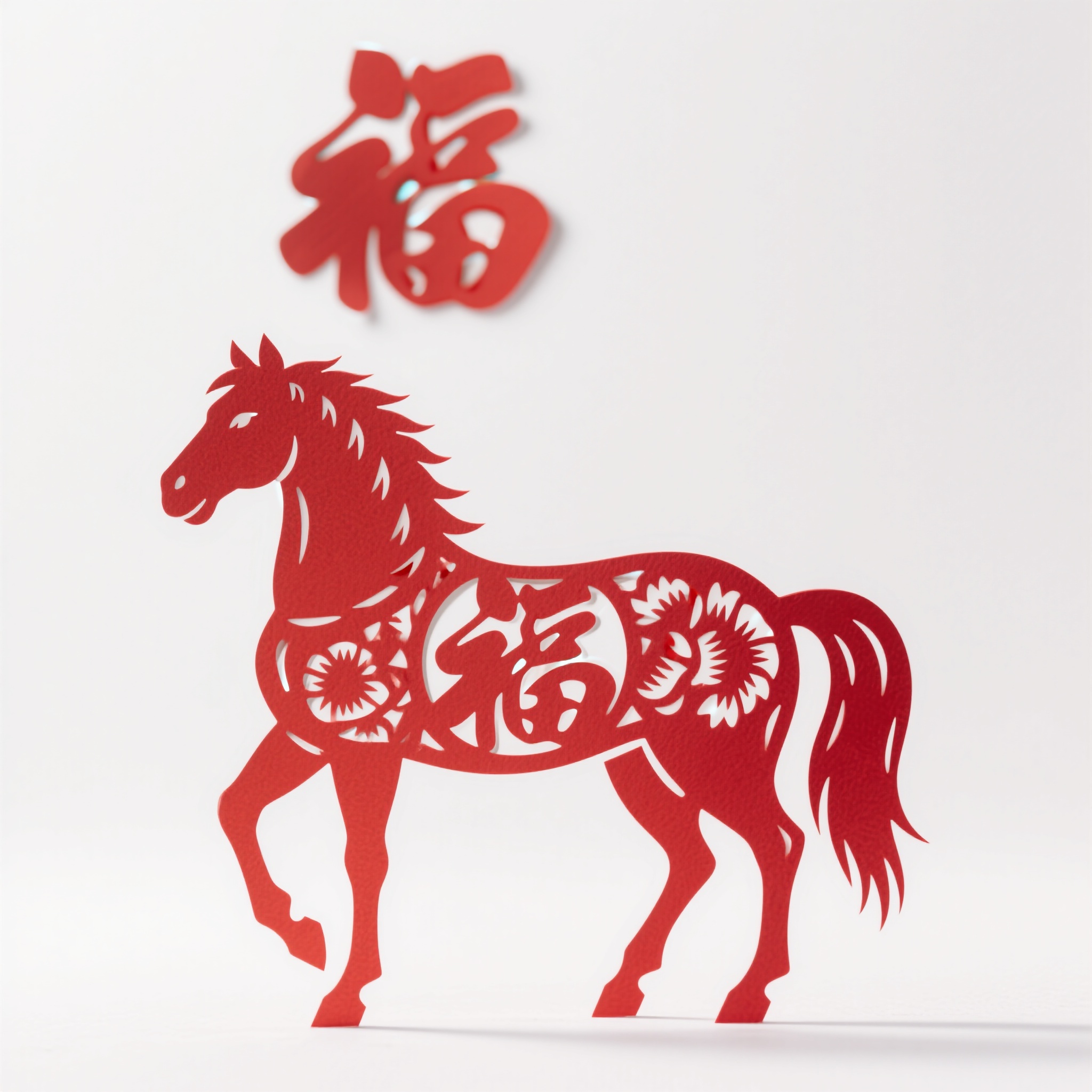 作品描述:剪纸福马,红马身镂空 “福” 字纹,站立姿态,剪纸边缘锐利,福字立体,传统年味。 画面背景白色