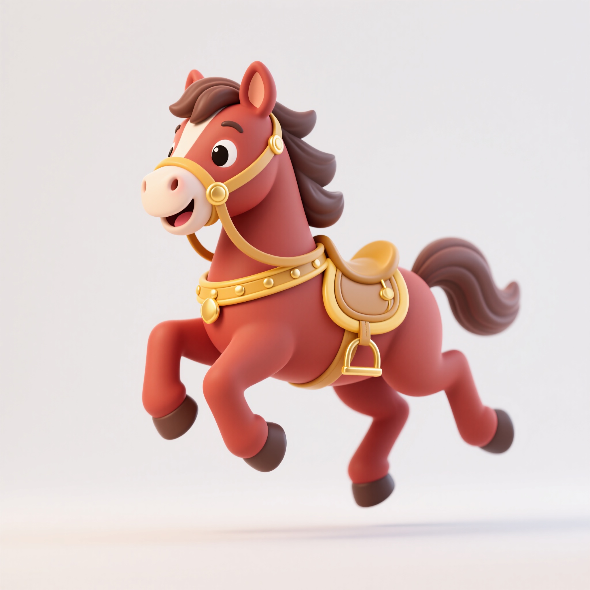 作品描述:童趣卡通马,红棕小马饰金黄简化鞍具,蹦跳姿态,表情呆萌,Q 版可爱风。 画面背景白色