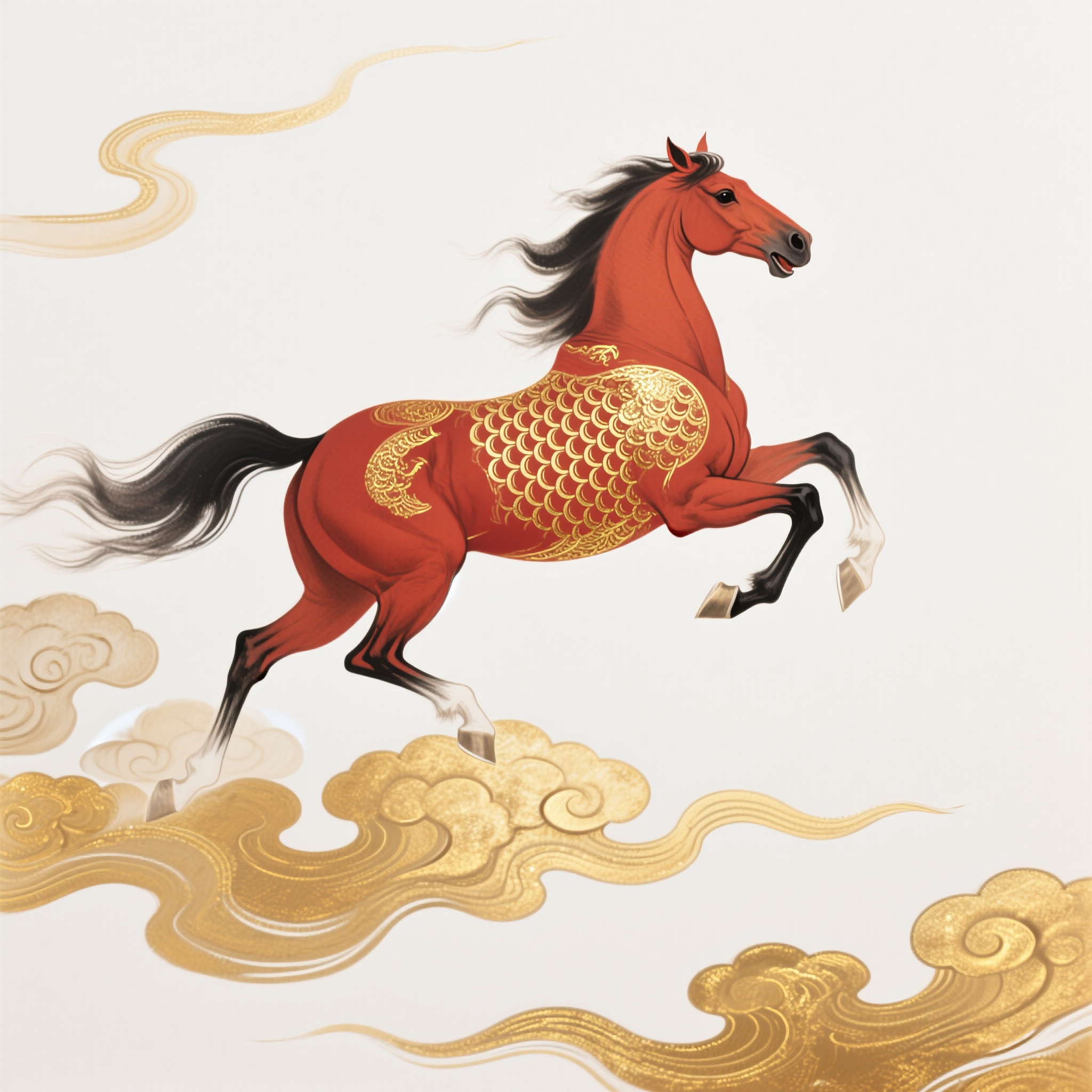 作品描述:跃马金云,红马踏金云饰金鳞纹,跃起姿态,国风写意风格,云纹流动马姿矫健,意境开阔。 画面背景白色