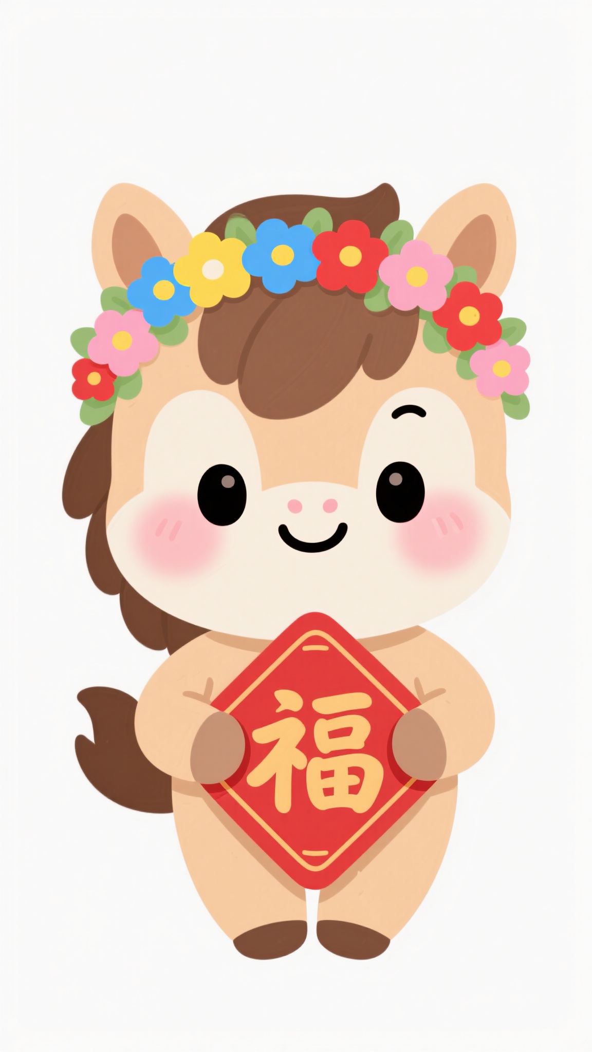 作品描述:Q 版卡通马,浅棕毛发,头戴五彩小花环(蓝黄红粉花朵),双手抱红 “福” 字牌,表情呆萌,萌系手绘风格,突出花环可爱感与福字牌简洁造型。 画面背景白色