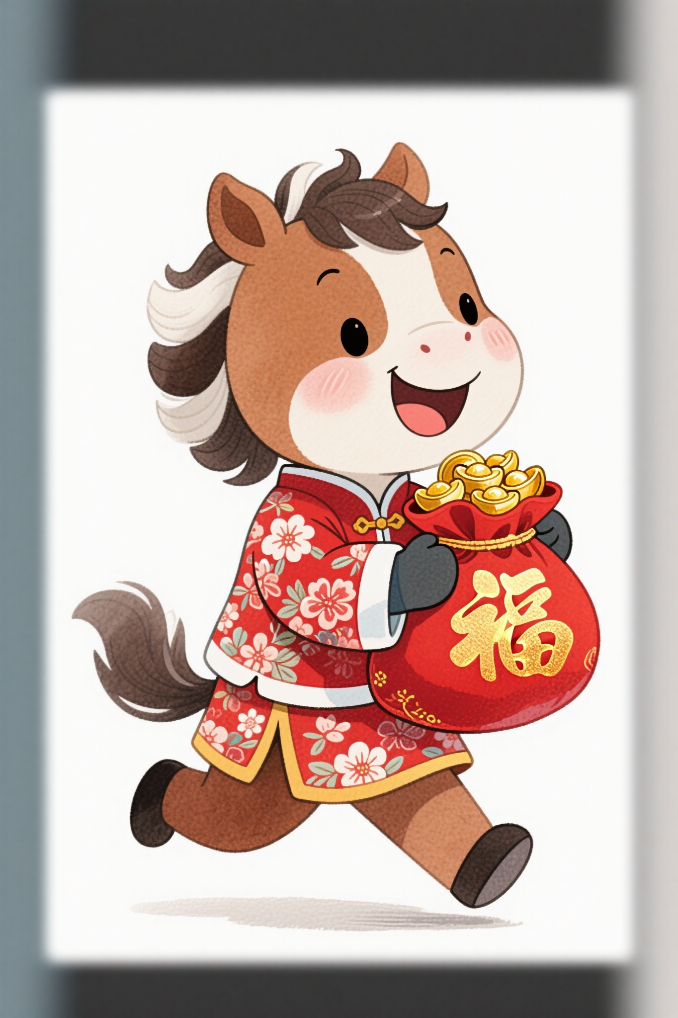 作品描述:Q 版卡通马,棕白毛发,穿红底碎花唐装,双手抱红福袋(装满金元宝,袋面金 “福” 字),呈奔跑姿态,表情开怀,手绘水彩风格,突出福袋饱满感与碎花唐装细腻纹理。 画面背景白色