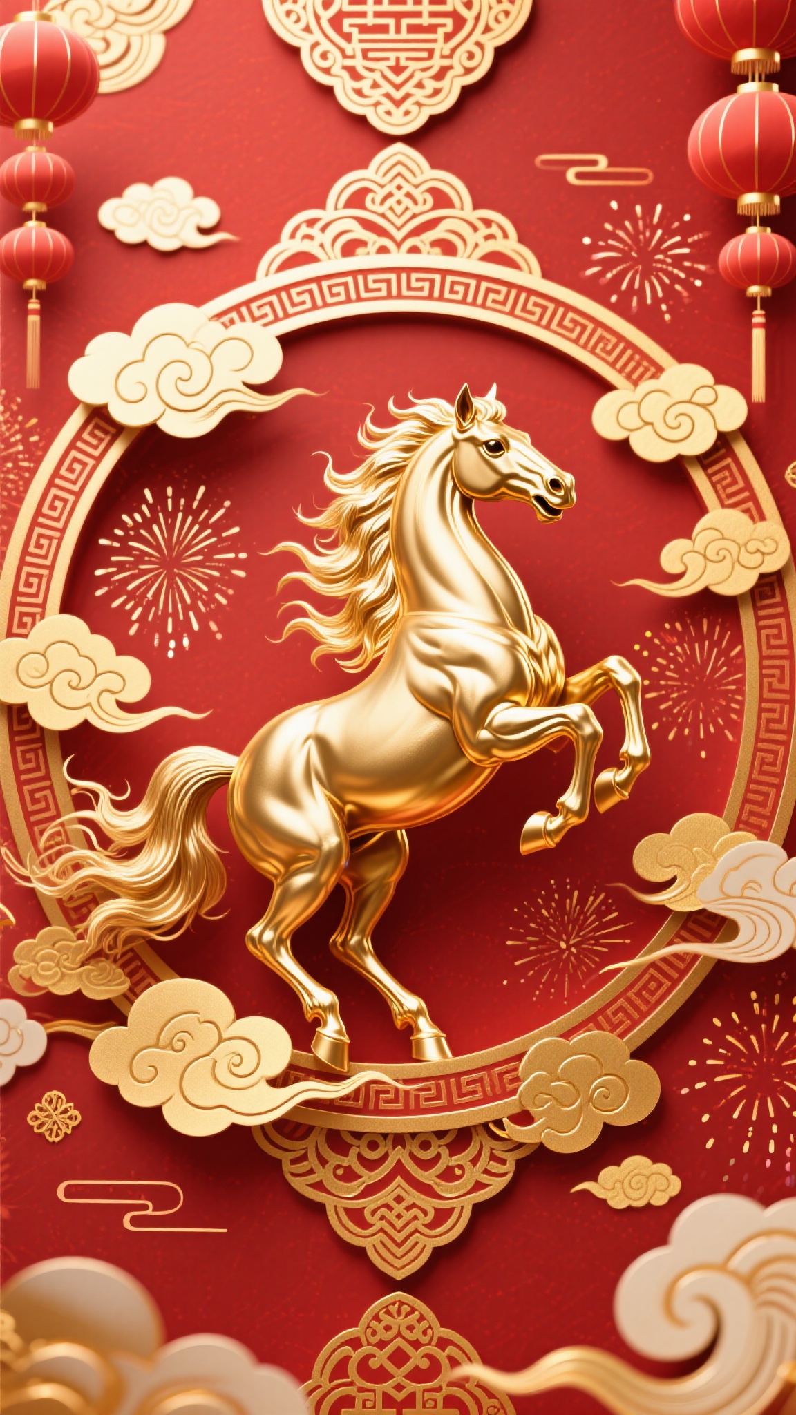 作品描述:国潮风格,红金配色,奔腾金马(毛发飘逸),环绕金色祥云与烟花,传统纹样点缀,春节氛围浓郁。