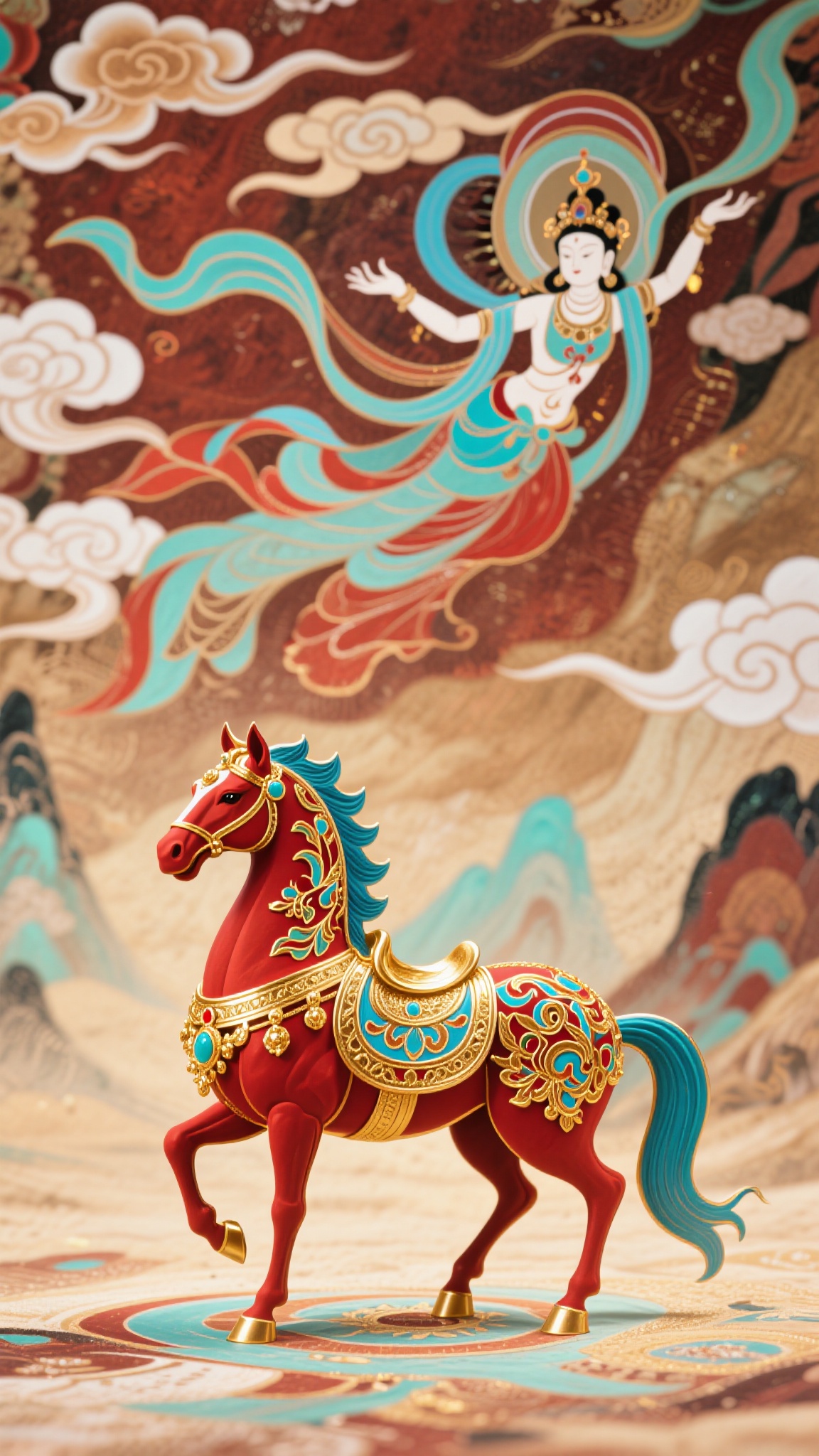 作品描述:敦煌风格,金马饰敦煌壁画纹样,色彩绚丽(红、金、蓝,位置在画面底部),背景飞天元素、祥云,西域风情浓厚。