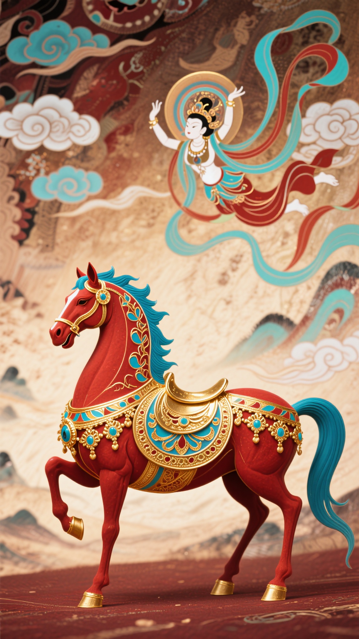 作品描述:敦煌风格,金马饰敦煌壁画纹样,色彩绚丽(红、金、蓝,位置在画面底部),背景飞天元素、祥云,西域风情浓厚。