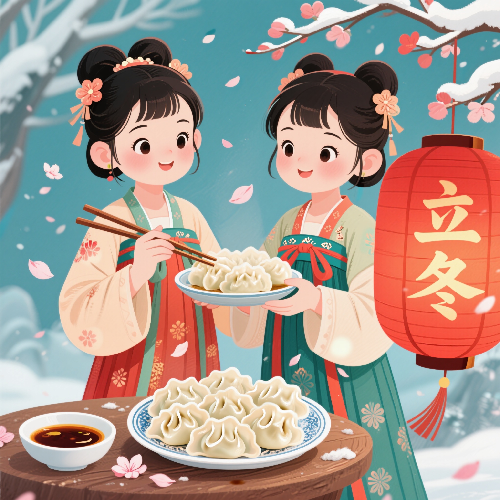 作品描述:卡通古风风格,立冬插画,双髻汉服女孩端饺子盘,手持筷子,旁立 “立冬” 红灯笼,一盘饱满饺子配蘸料,花瓣飘落童趣国风,