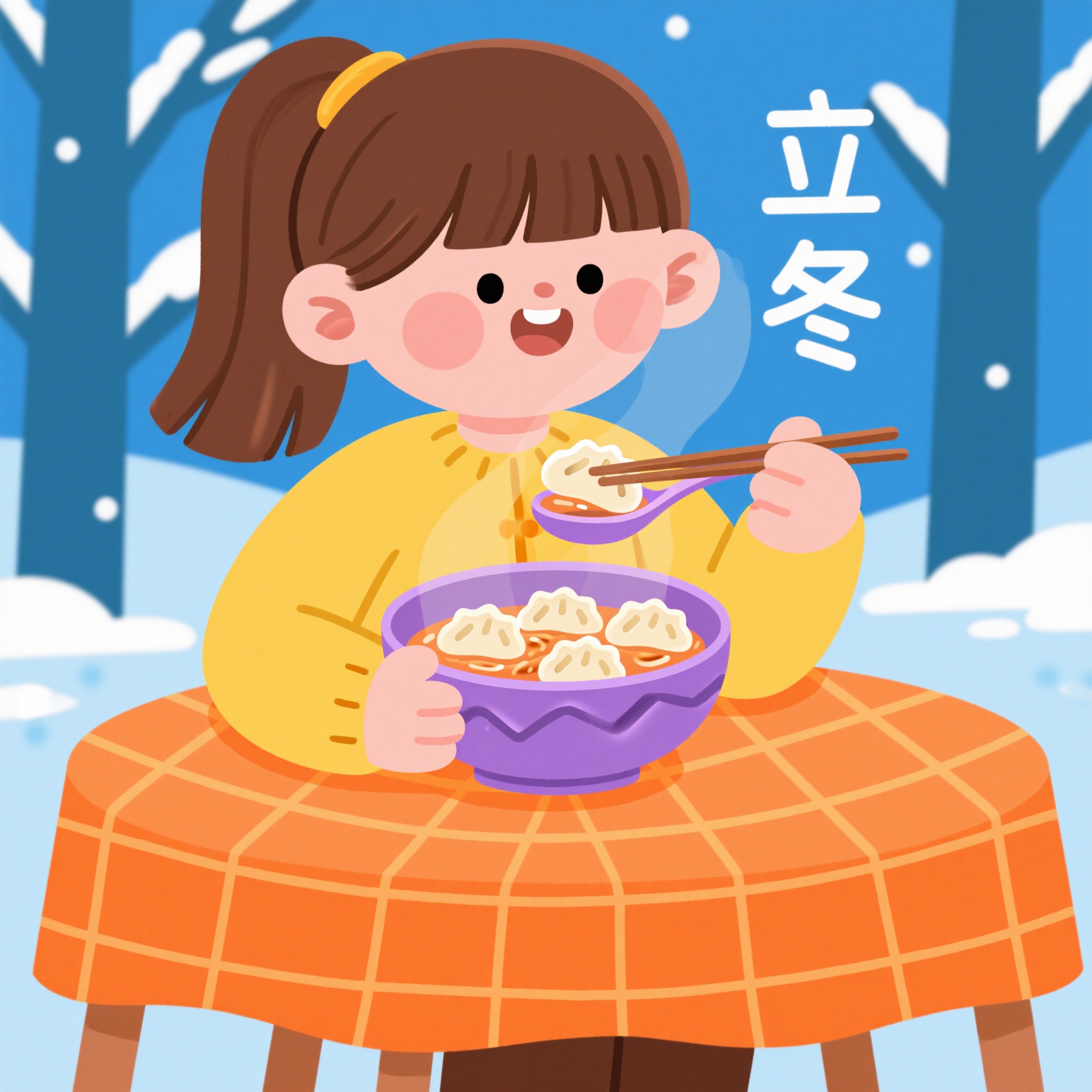 作品描述:卡通清新风格,立冬插画,棕发马尾女孩穿黄衣,持筷子和勺子吃紫碗汤饺,橙色桌布点缀,风格活泼明快